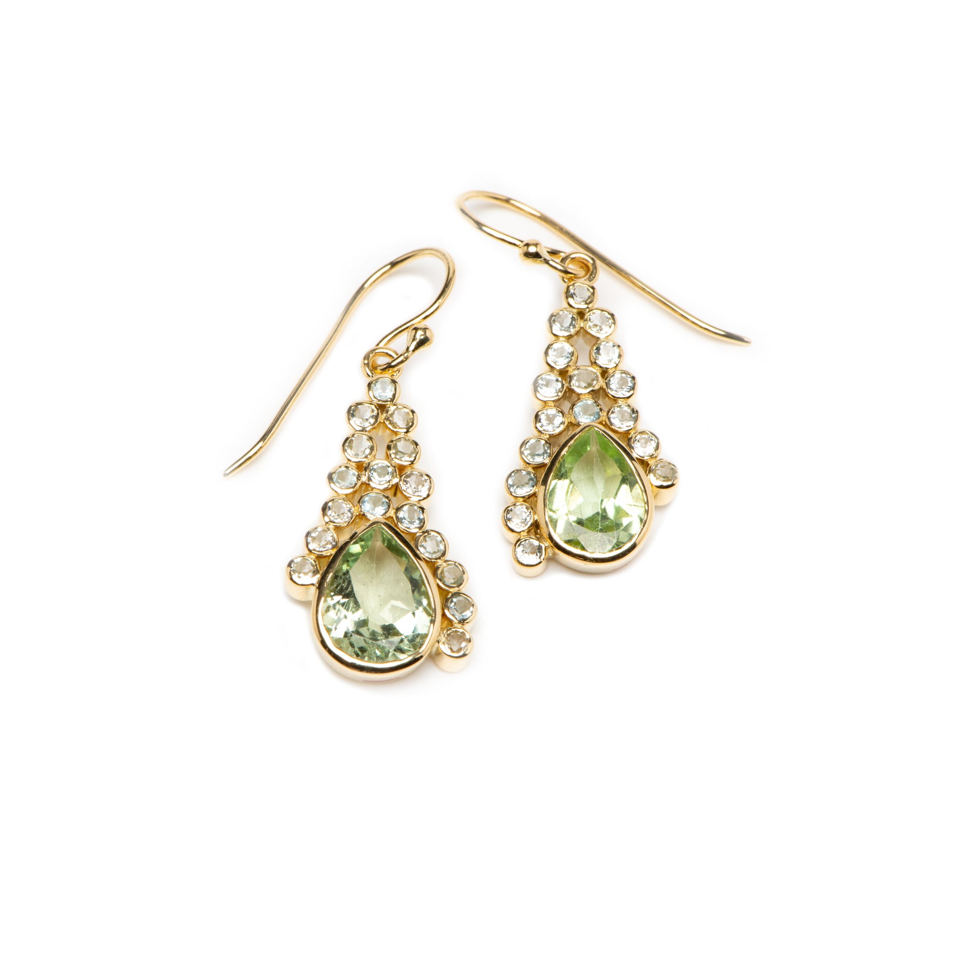 Grace, the force that counters gravity. Pale green natural Aquamarine artistically designed reminiscent of water falls, fauna, and dance, rises to the occasion. 18k yellow gold and natural aquamarine.