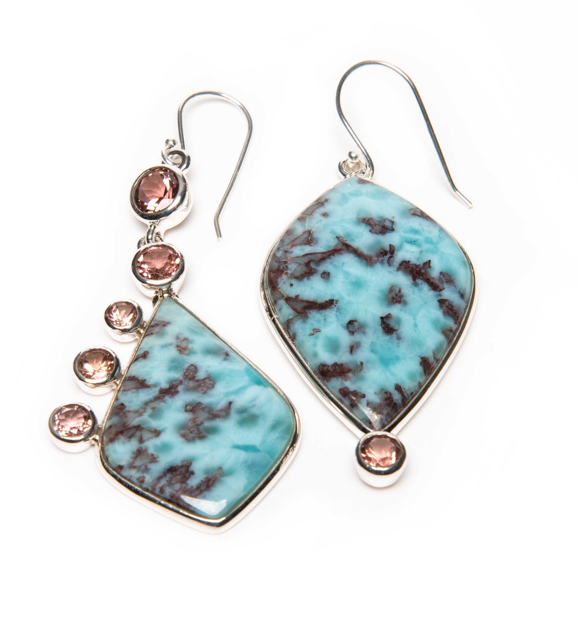 These perfect asymmetrical earrings are a color compliment of rose and blue. Larimar with cabernet inclusions is accented with pink tourmaline. They are meant for the woman who loves big unique earrings. 25mm in size and perfectly light-weight. You’ll absolutely love these! ONE OF A KIND