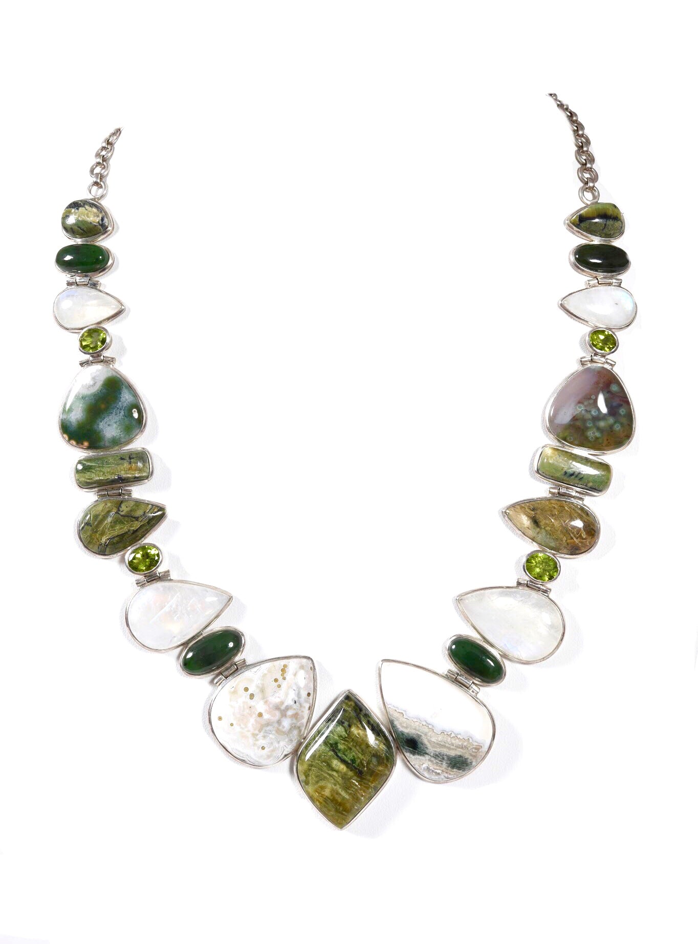 Green and white toned Ocean Jasper with jade, peridot, moonstone, and rare green opal, perfectly hinged together for a stunning statement of beauty!
