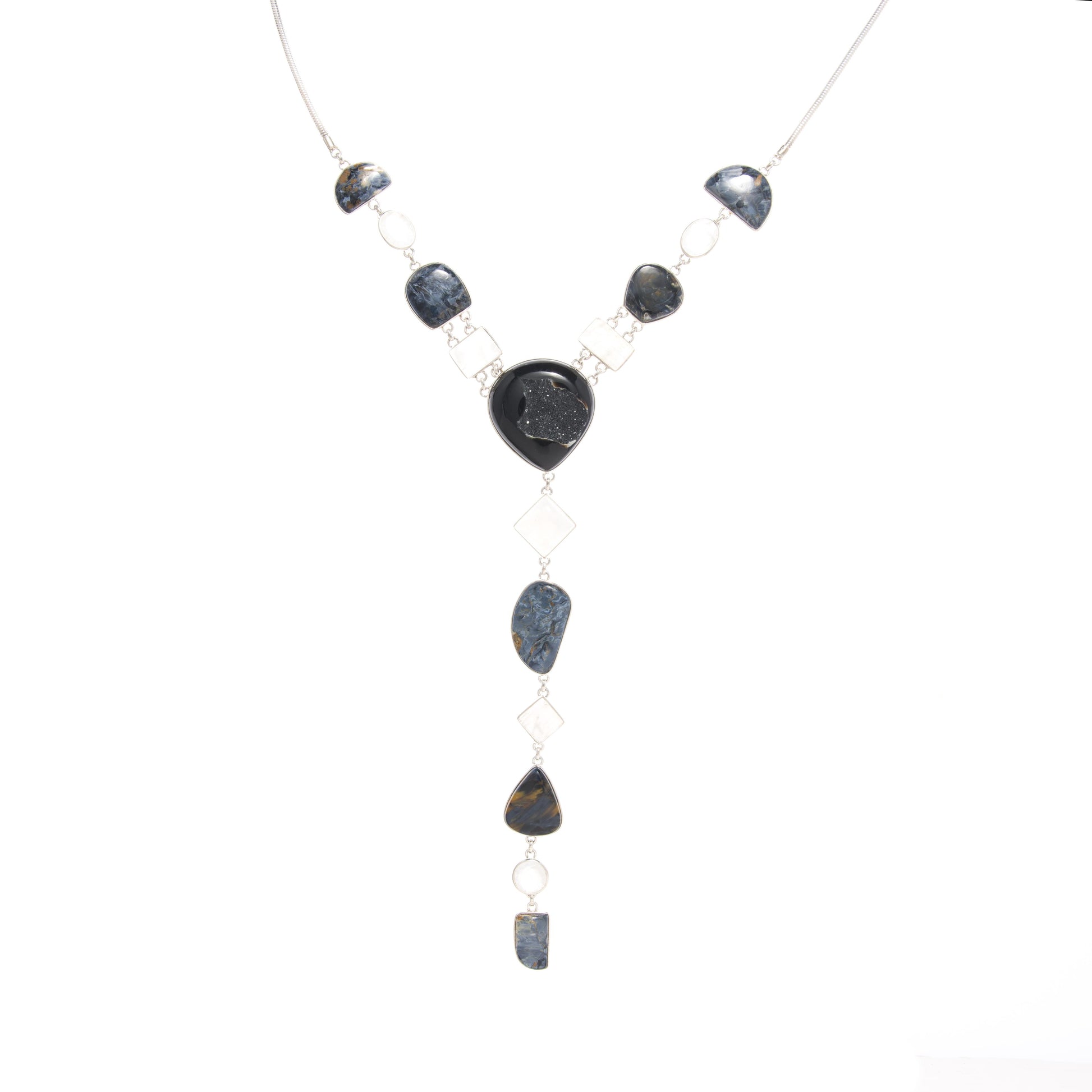 Some things are black and white. Life covers a spectrum, has an ebb and flow, of night and day. This signature best selling extended Y necklace is set with a stunning center piece of druzy Black Onyx and accompanied by rare Namibian Pietersite, and opalecent moonstone. Statement sized gemstones capture fascination. Black and White color scheme is perfect with solids and creative with patters.