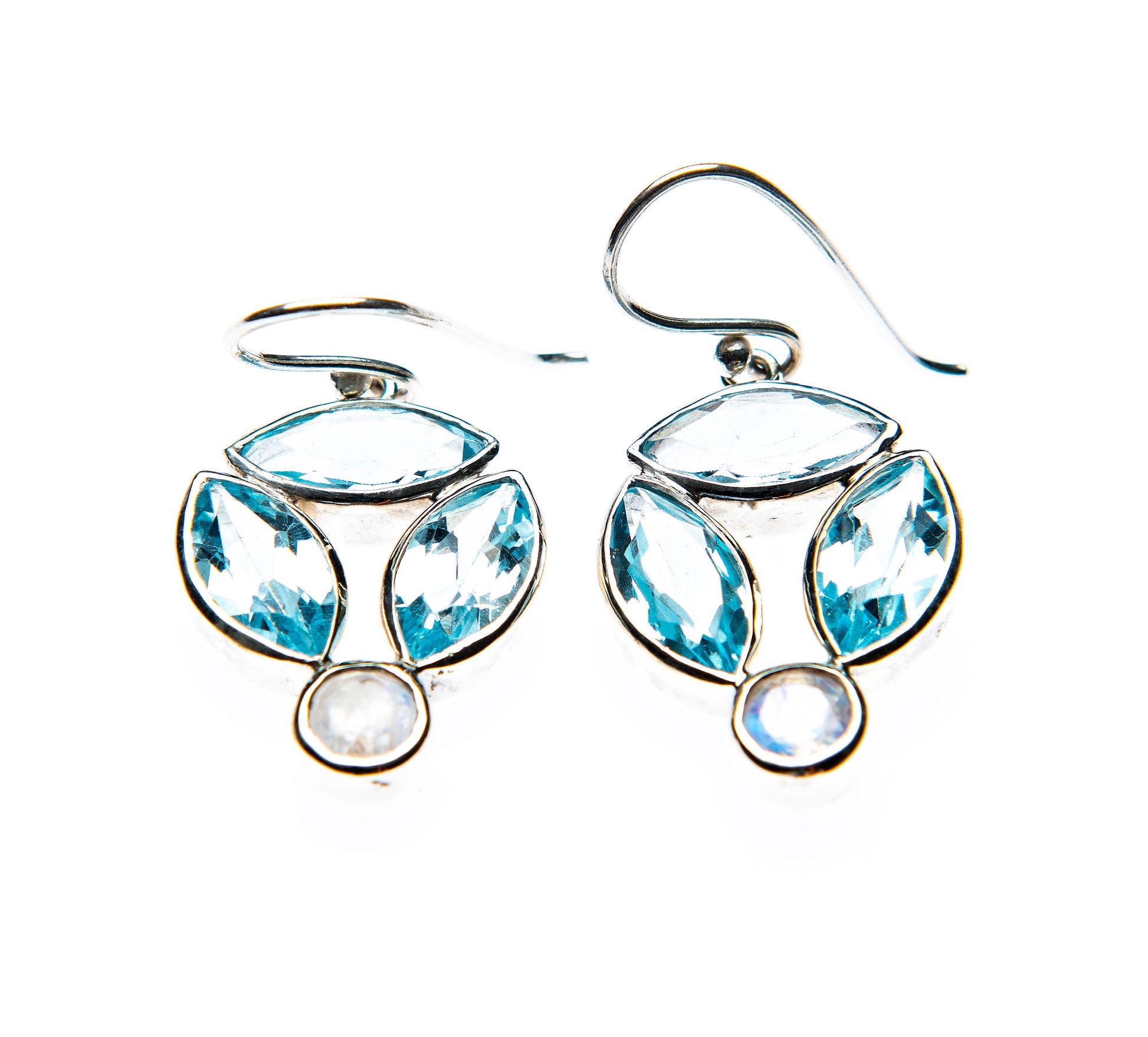 Marquis blue topaz rounding a blue fire moonstone. Lightweight unique dangles.
