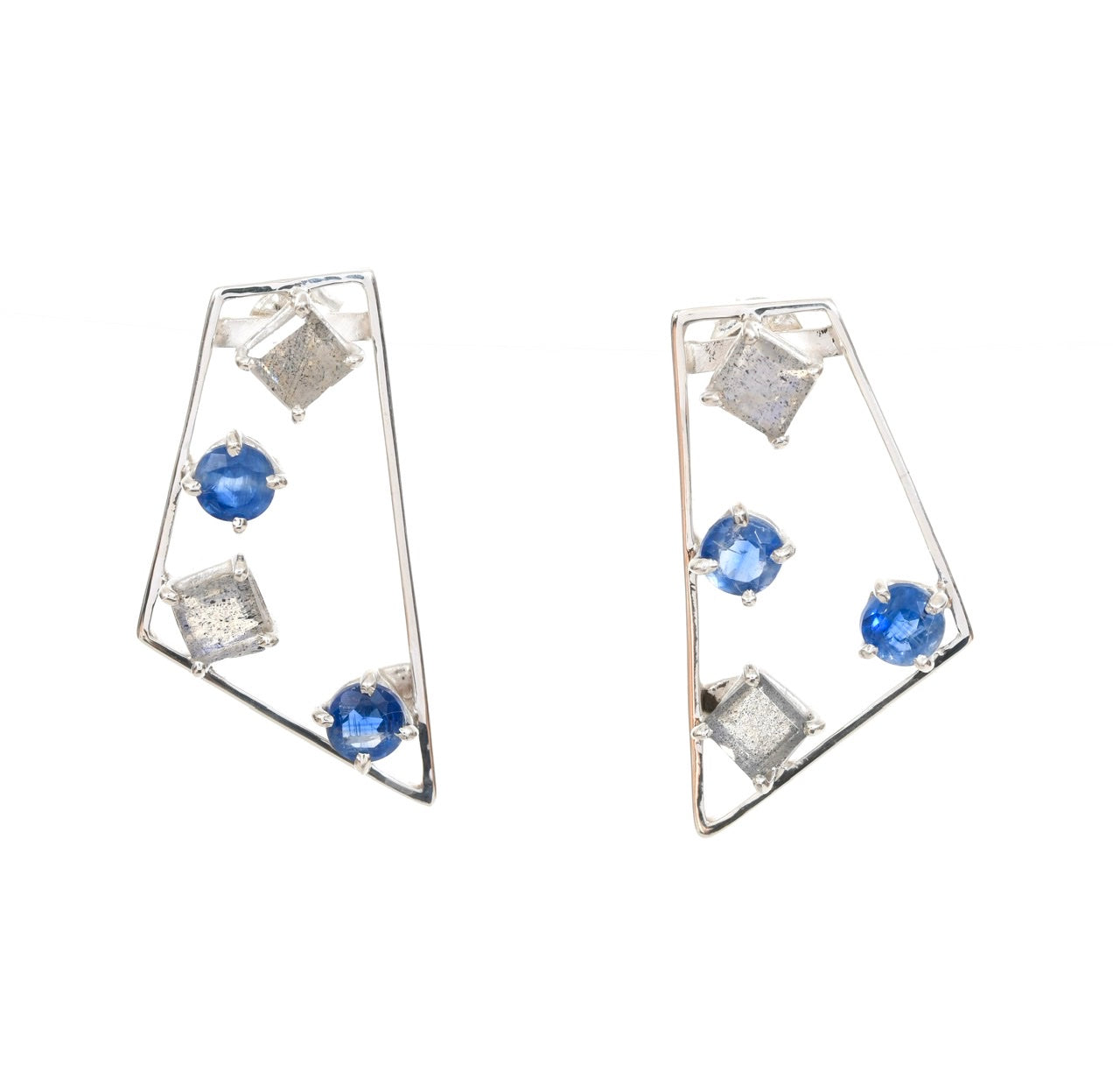 Absolutely stunning pallets of shimmering slate color mystic labradorite and sapphire blue kyanite floating in an aesthetic geometricart frame. Regal, artistic, impressionable, mosaic earrings. At 1.2” these statement mosaics are remarkable. A pair to love forever!