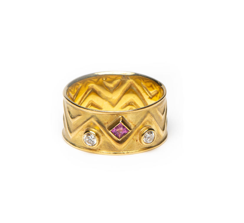 A rare repose ring. This ancient technique developed in Egypt is accented with diamonds and pink sapphire and designed with the peaks of the mountain. Size 6.