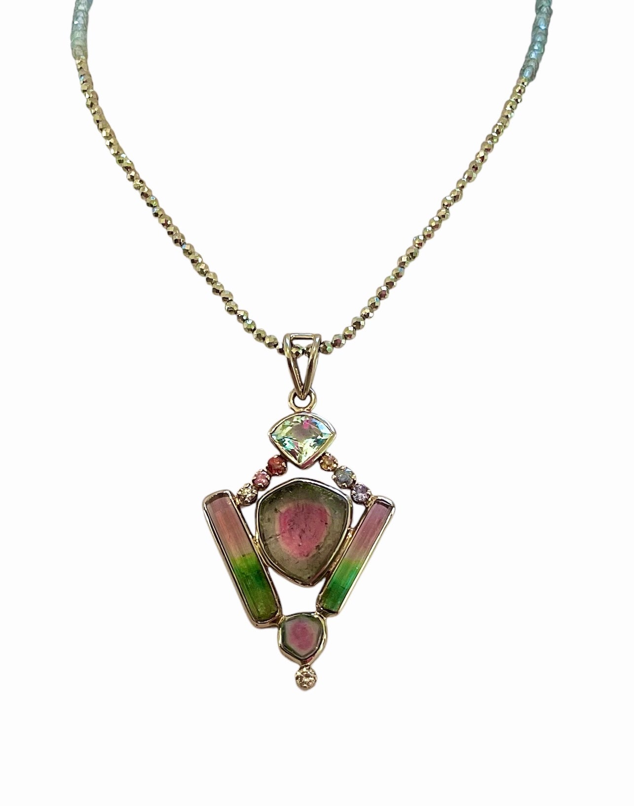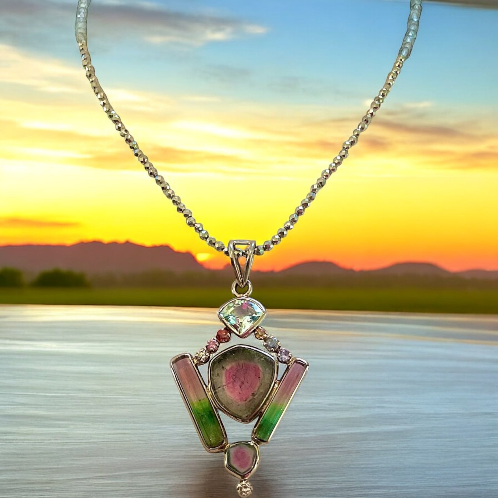 18k palladium white gold (no nickel) pendant uniquely constructed with intention. Bicolor watermelon tourmaline, aquamarine, diamonds and sapphire, mystic, enchanting and compelling