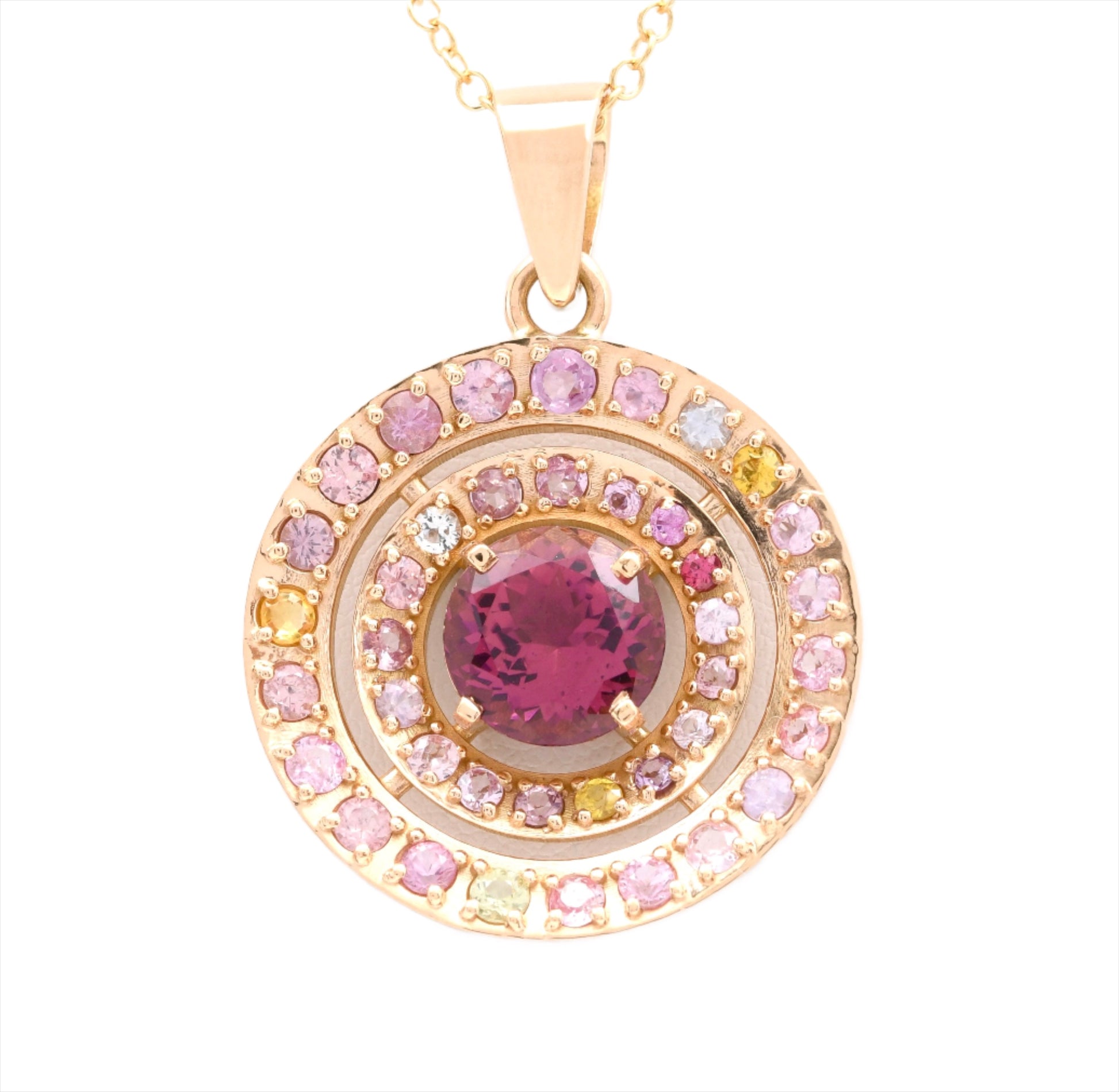 Imagine possessing a unique symbol of self-love, enhancing your daily experiences, and fostering deeper connections. Our mesmerizing pendant is specifically designed to guide you through every dimension of love. It features a breathtaking 3ct pink tourmaline, nestled within a delicate arrangement of pink, white, and yellow sapphire discs, all set in luscious, peach-toned 18k gold. This one-of-a-kind piece not only radiates elegance but is also a testament to individuality. Don't miss the opportunity to own something so extraordinary.