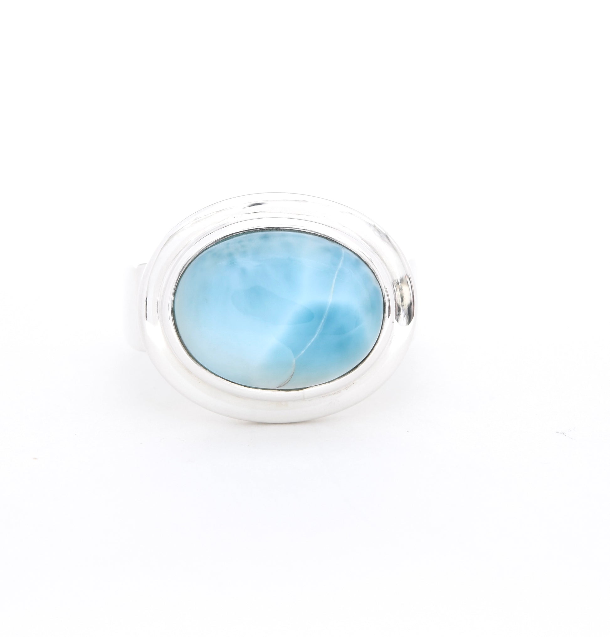 Vibrant blue and white oval shaped AAA Larimar statement ring. Gemstone size approximately 10mm x 14mm. Larimar can vary slightly in color.