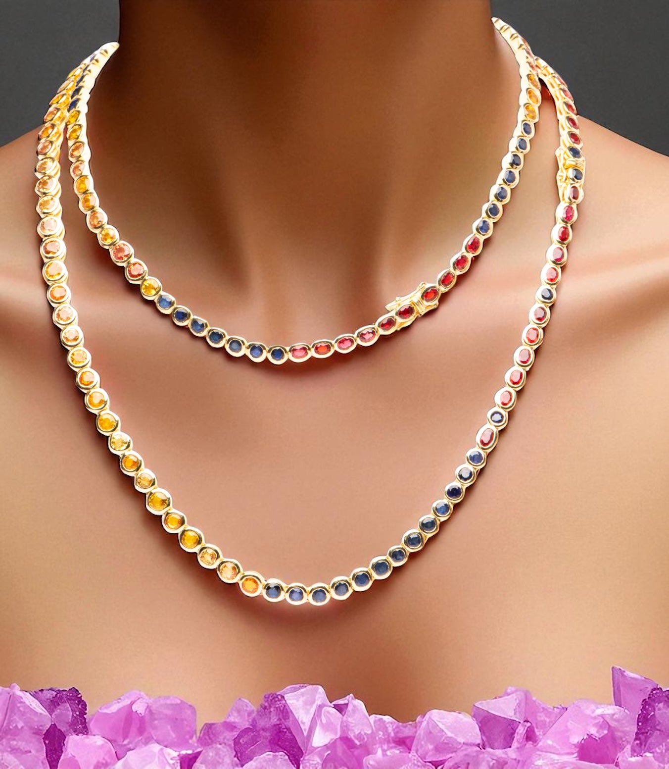 A sapphire palette of red blue and yellow in 18k yellow gold. Nature's jeweled rainbow of individually hand selected gemstones. 3 pieces come with this set: A 17 " necklace and two 7" tennis bracelets. Layer for a double look, wear individually, or as one long piece.