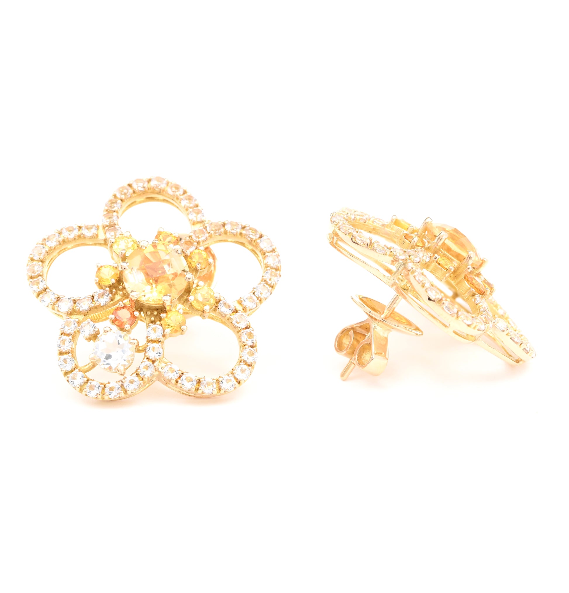 Gaze at the stars and you see flowers. Gaze at flowers and you see stars. Organic asymmetry within symmetry. Images of beauty enchants us in our dreams under celestial skies. This design inspires the impression of the natural plumeria artistically. It creates uplifting, light, beautiful, happy feelings. White sapphire, yellow sapphire and citrine in 18k yellow gold.