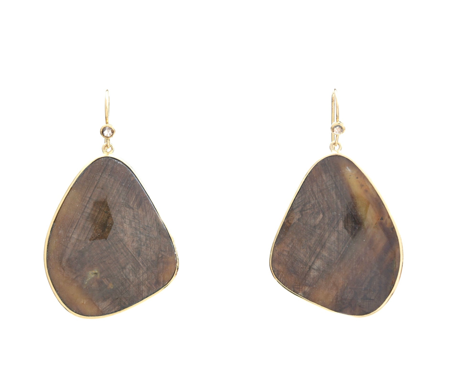 Elegant, unique, artistic, versatile and fashionable and extremely unique cut. Shimmering chocolate sapphire in 18k wears perfect on any occasion! Very light weight and large for the perfect statement earrings!