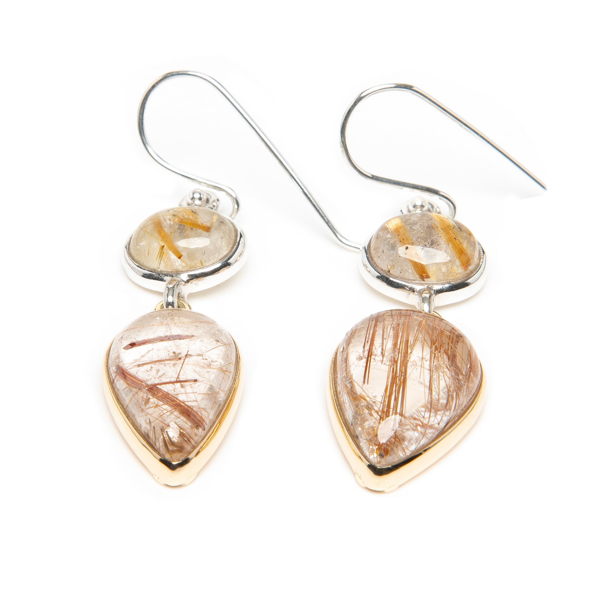 Shimmering crystal cut Oval Golden Rutilated Quartz and drop shaped burgundy rutile. Length=1.5”