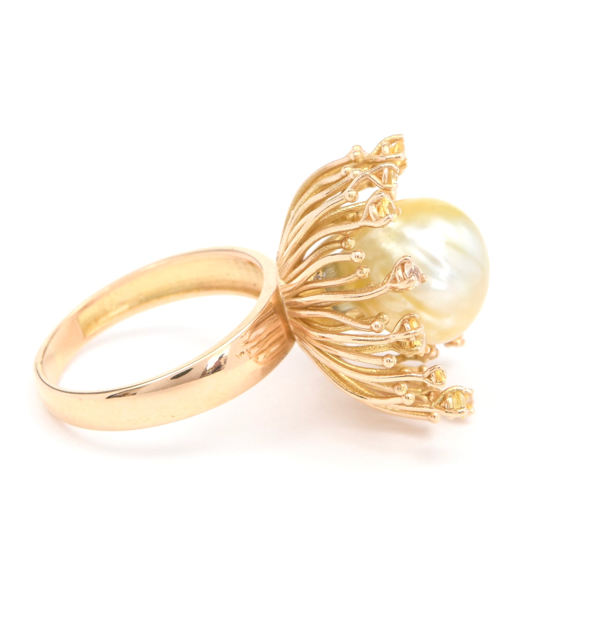 A natural golden south sea pearl nestled in a coral design cast in 18k yellow gold, and yellow sapphire. Remarkable.