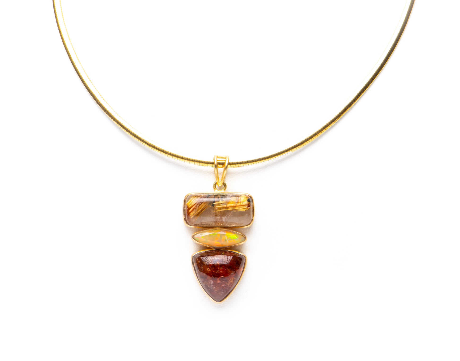 Golden rutilated quartz,opal,and golden red tourmaline set in 18k yellow gold with a 16" reversible yellow and white gold Italian 4mm omega.