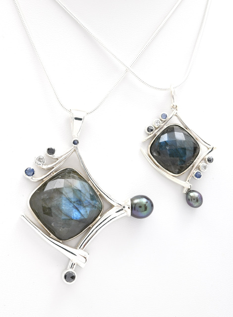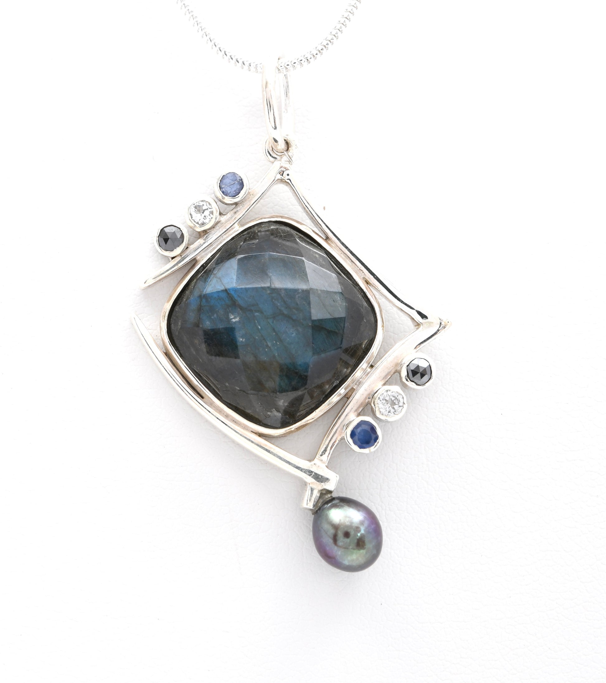 This pendant captures the mystic essence of the peaks of waves, and the sentiment of amazement. The labradorite center gemstone reflects an array of watery, fiery color and is surrounded by sapphire and black diamond, accented with a beautiful Tahitian pearl.