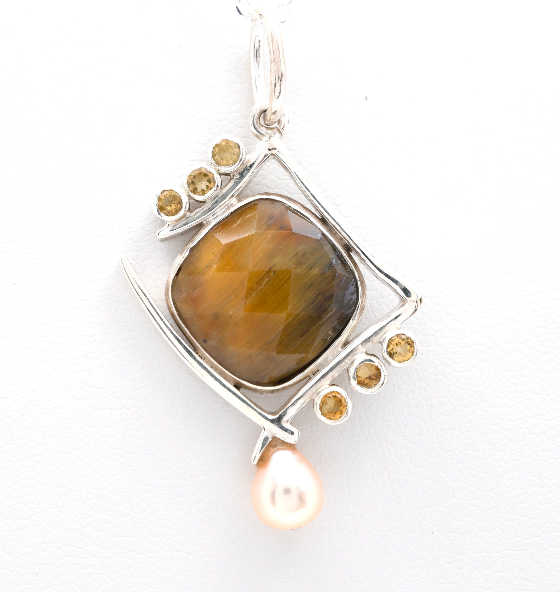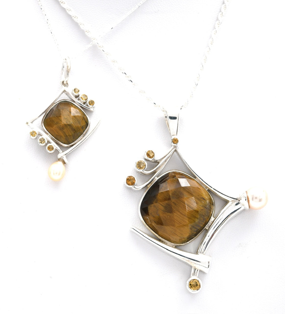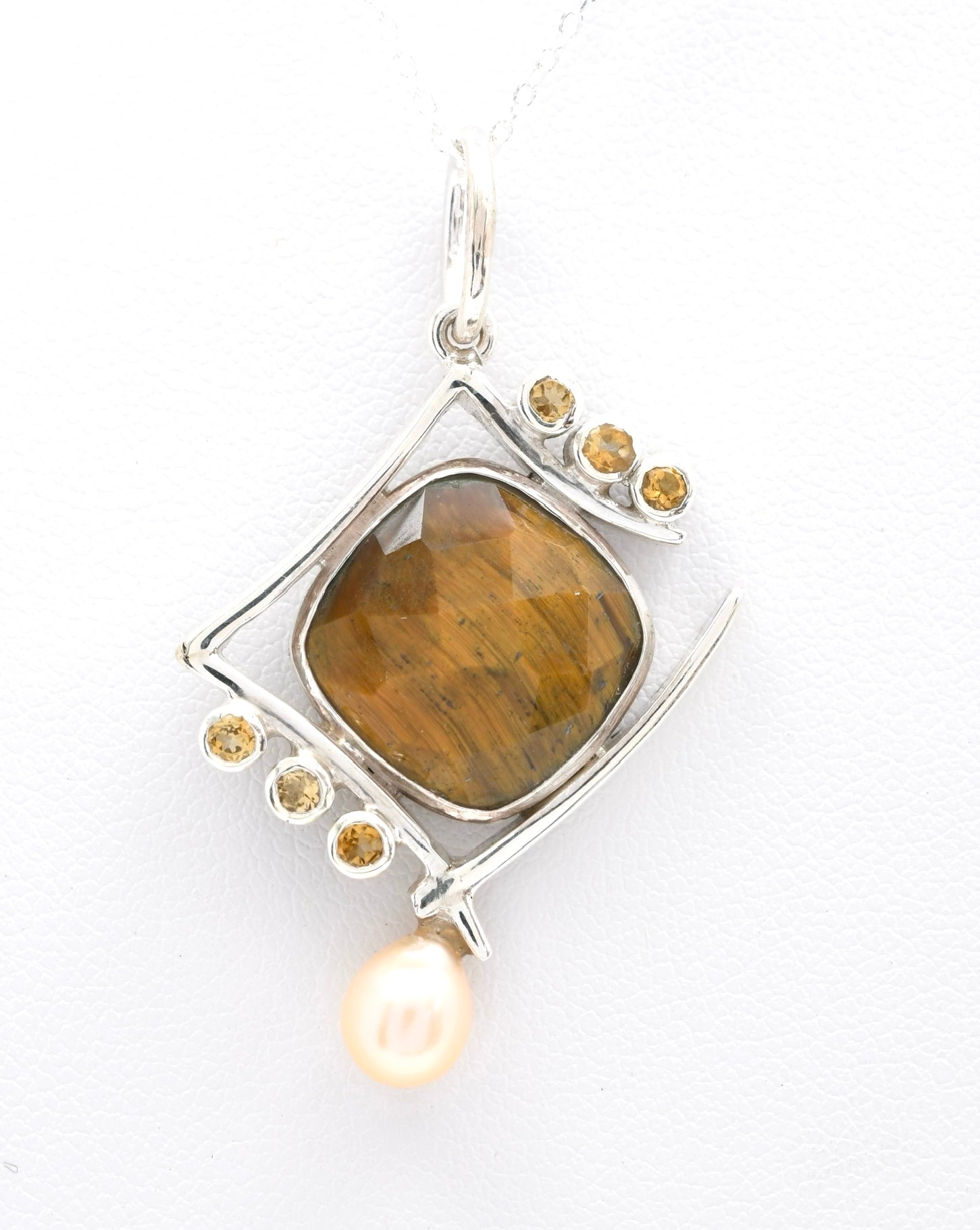 This pendant captures the natural allure of a tiger combined with the essence of the peaks of waves, and the sentiment of amazement. Adorned with freshwater pearl, and sunlit citrine.