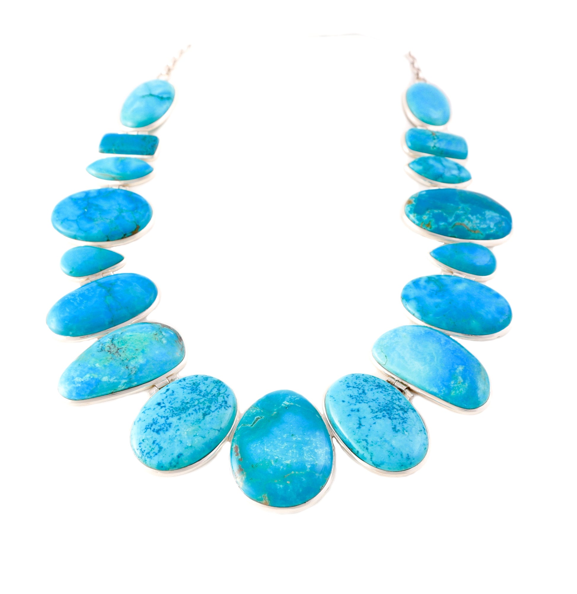 Turquiose at its absolute best! Bright, brilliant, stunning statement. Hand selected rare a precious Tibetan turquoise hinged together in sterling silver to lay perfectly across the chest 19”-26”. Perfect with matching earrings and bracelet.