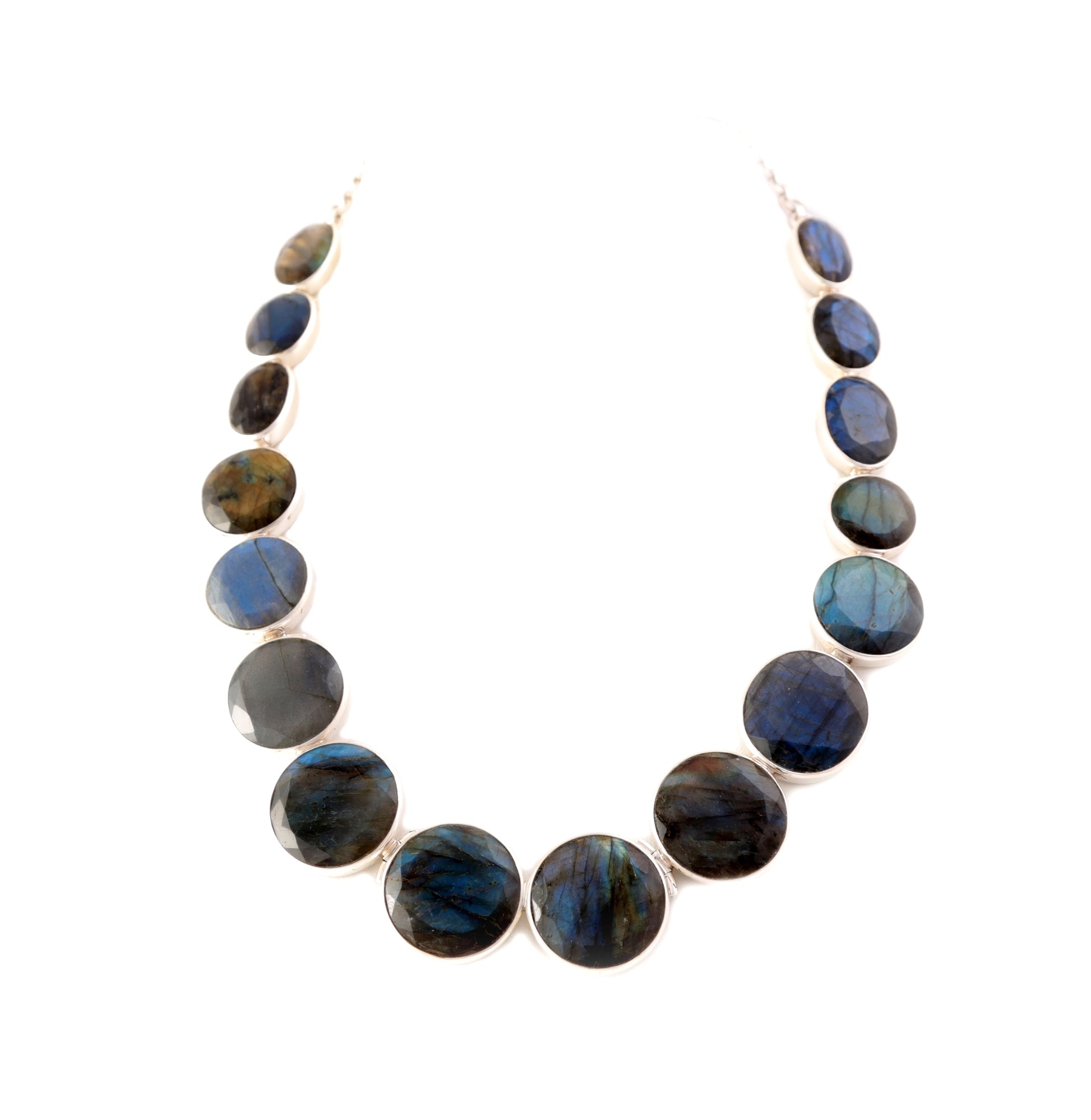 Labradorite at its absolute best! Bright, brilliant, stunning statement. Hand selected shimmering blue and golden flash mystic labradorite hinged together in sterling silver to lay perfectly across the chest 19”-26”. Perfect with matching bracelet.