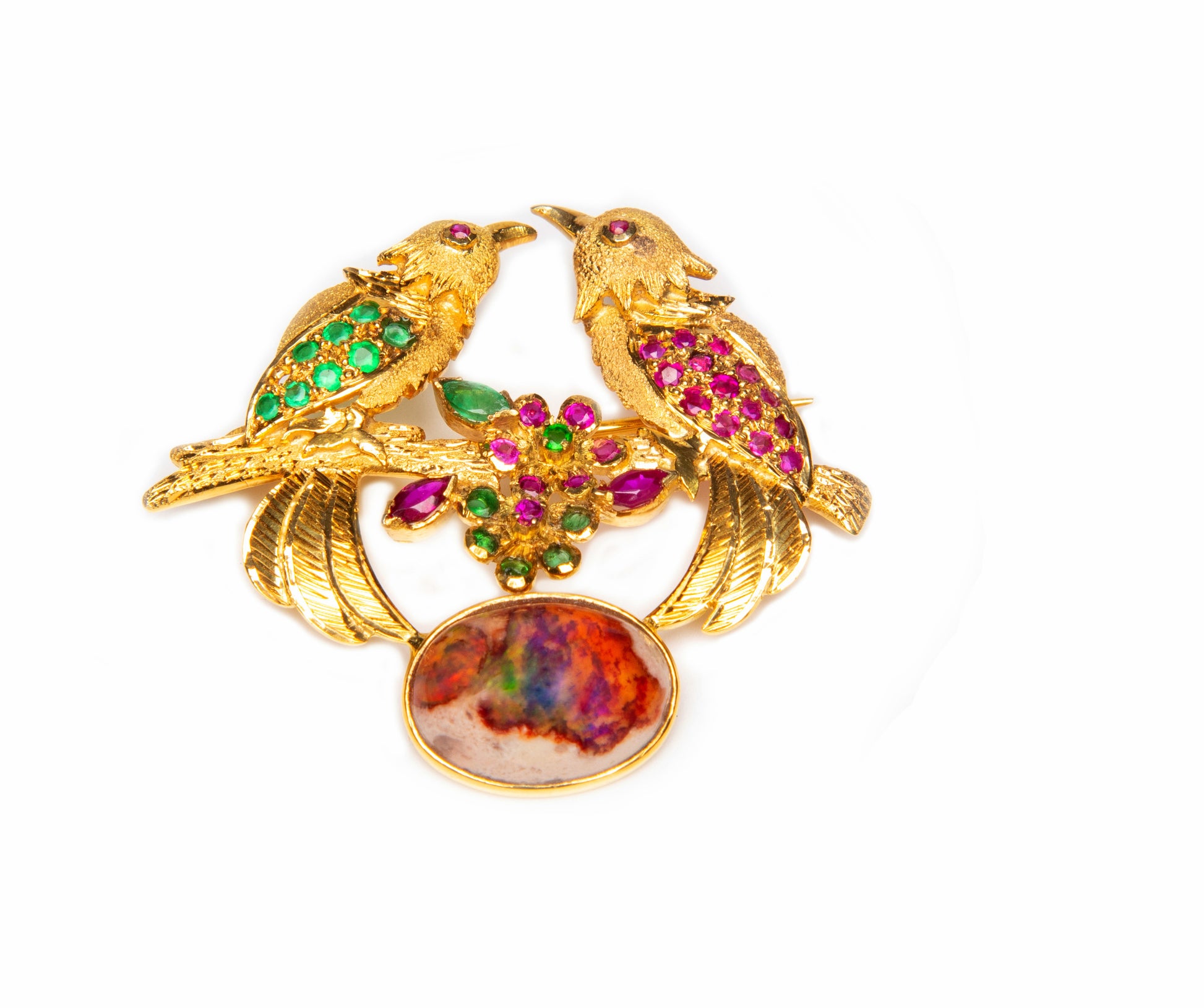 Two hearts joined together in a partnership of love carrying between them the ever sparkling flame of a fire opal. 22k and natural all natural Burmese ruby and emerald.