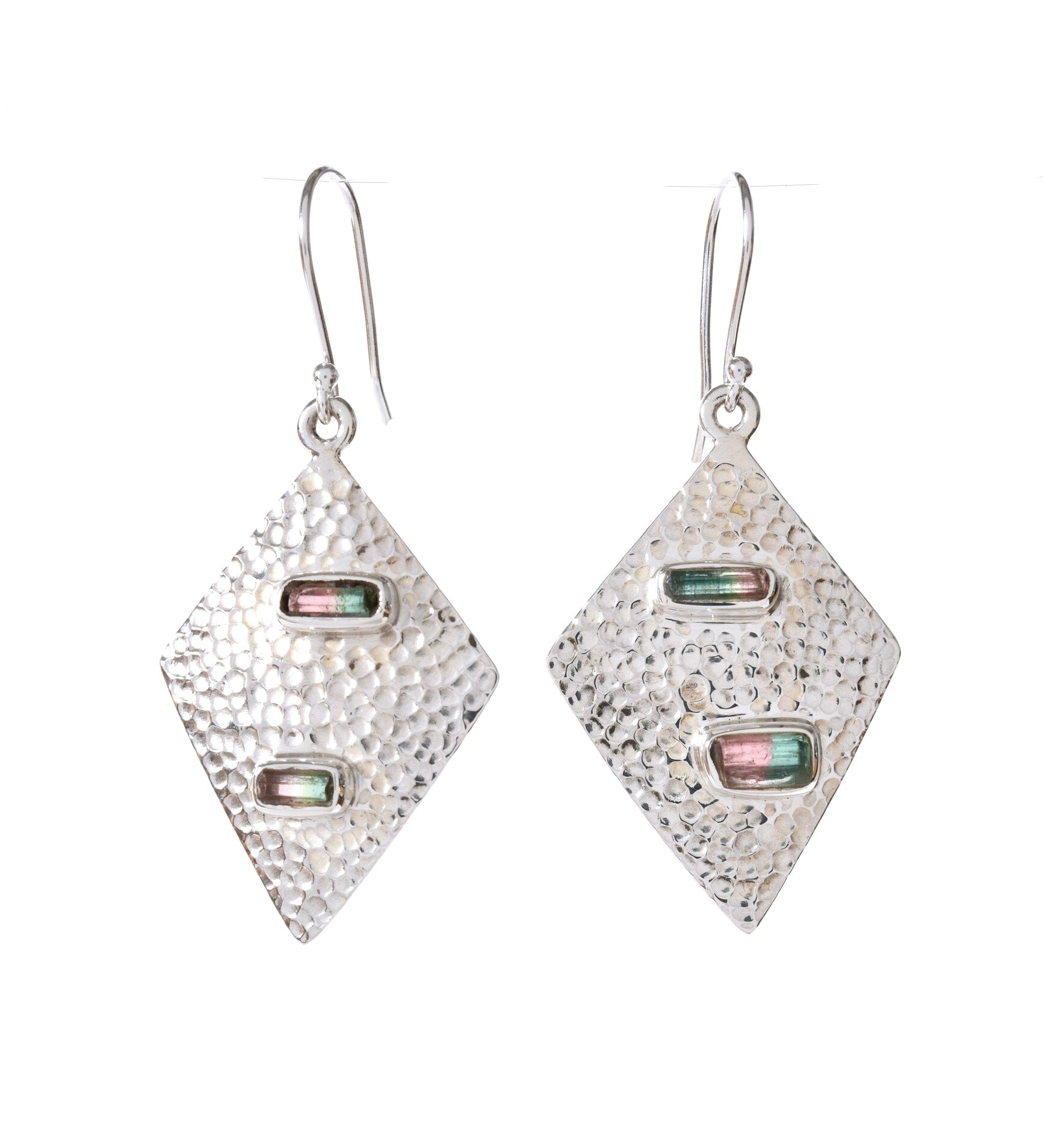 Two Marquis gemstones on a hand hammered sterling silver rhombus. Lightweight artistic pieces.