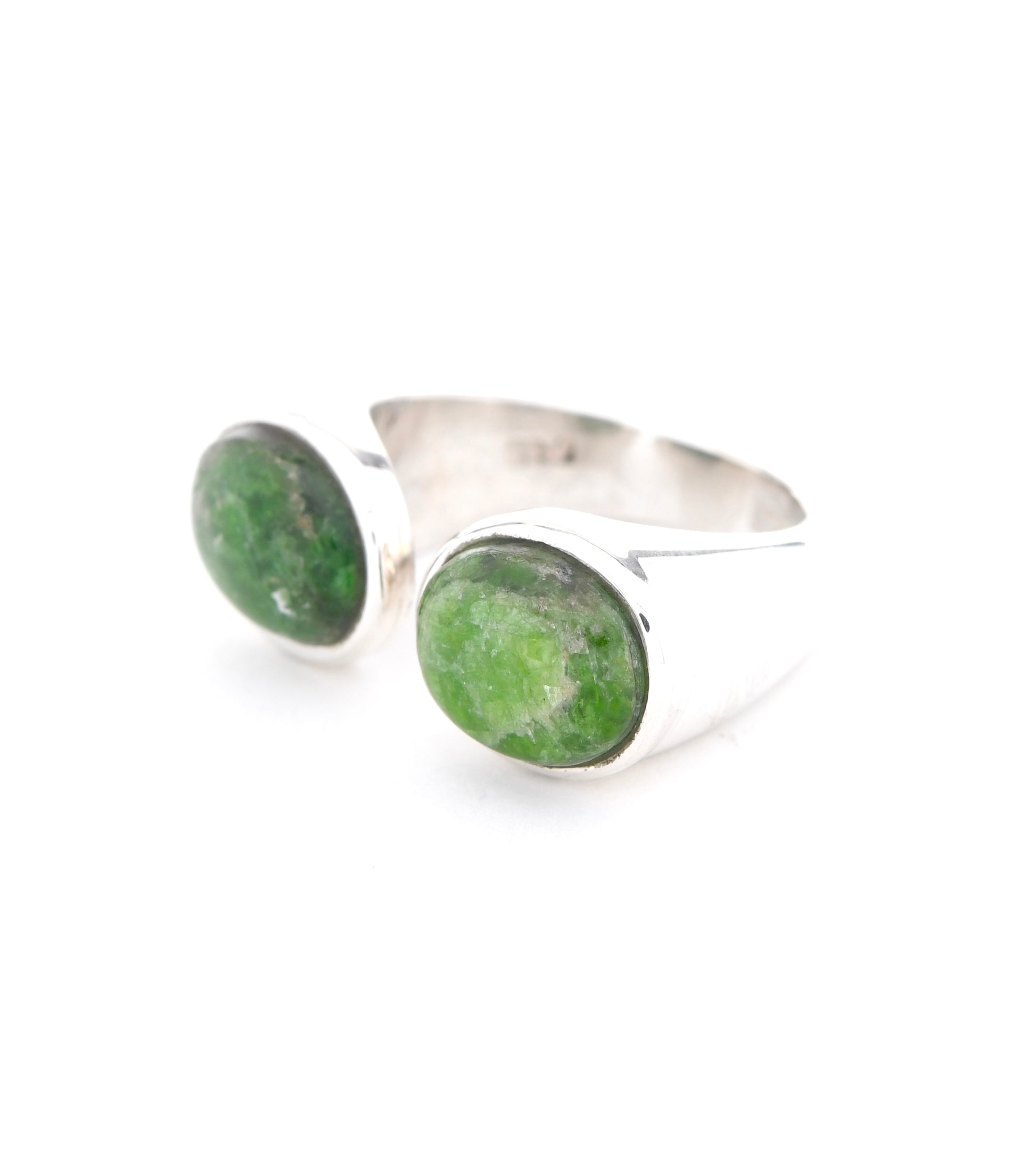 Two oval chrome diopside (Siberian emerald) in a unique style easy to stack with other rings. Gemstone size approximately 12mmX10mm