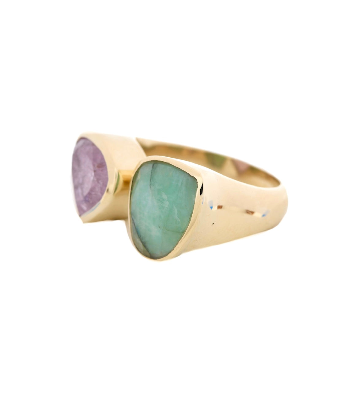 Beautiful natural emerald slice and kunzite set in 9k Yellow gold. Size 7-8