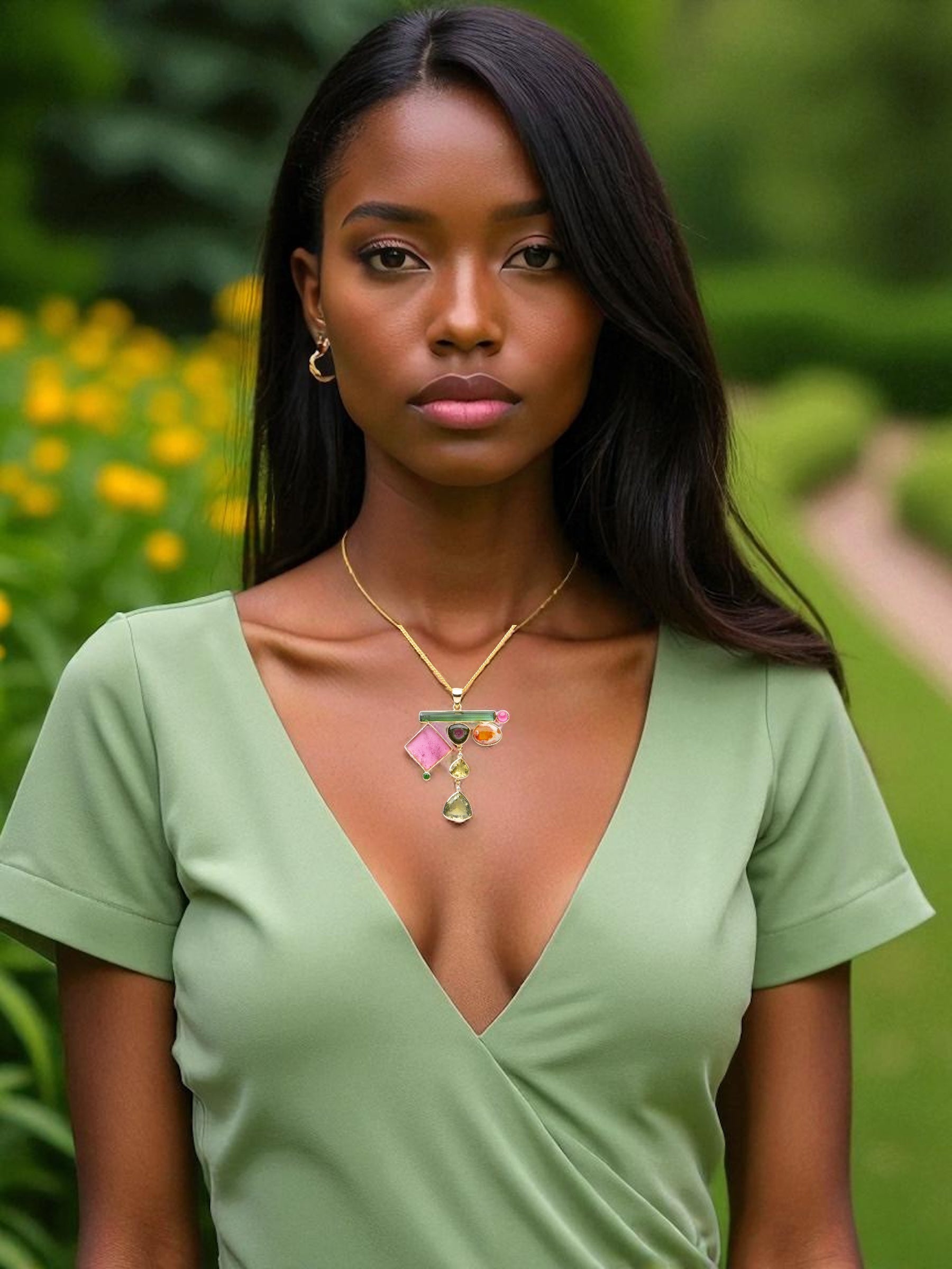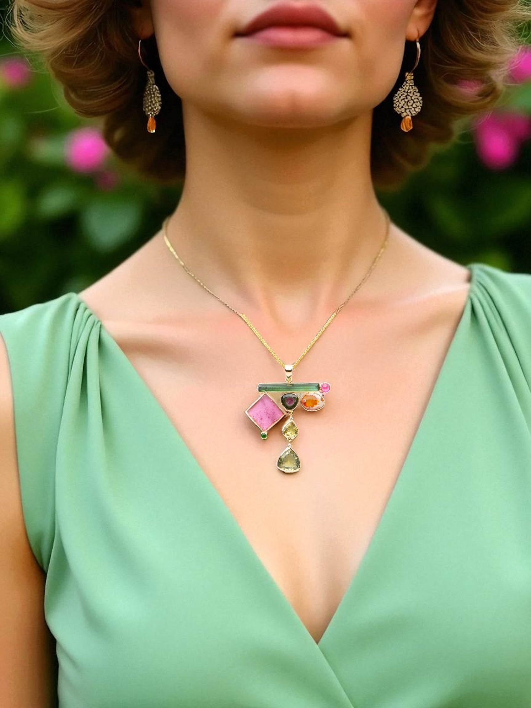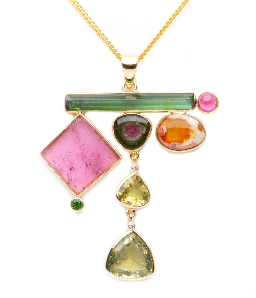 Wearable art at its best! Absolutely one of a kind. An organic perfect creation of natural color precious gemstones set in 18k yellow gold including: teal tourmaline, green aquamarine, watermelon tourmaline, mexican fire opal, pink tourmaline, diamond and emerald.