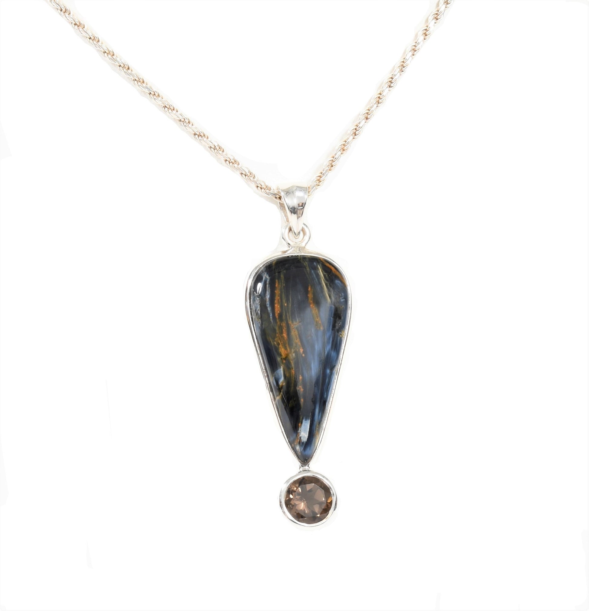 Art of the earth, slightly opalescent Black foundation with tones of blue grey white and gold with a brilliant smoky quartz. Medium-large.