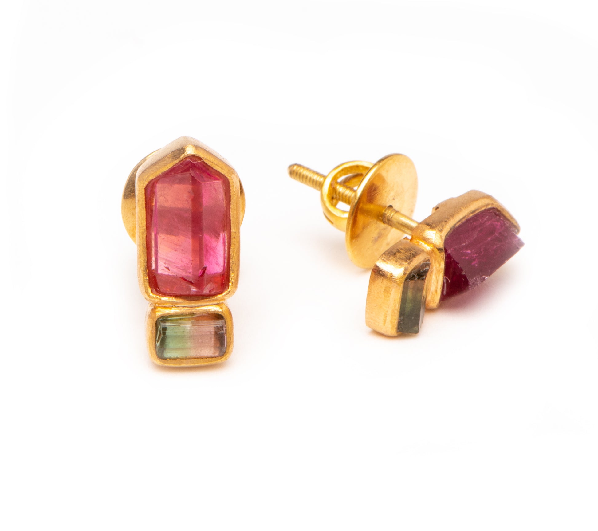 Natural Pink tourmaline set in peach toned 22k with watermelon tourmaline as deco studs, modern and fantastic! Screw backs for security.