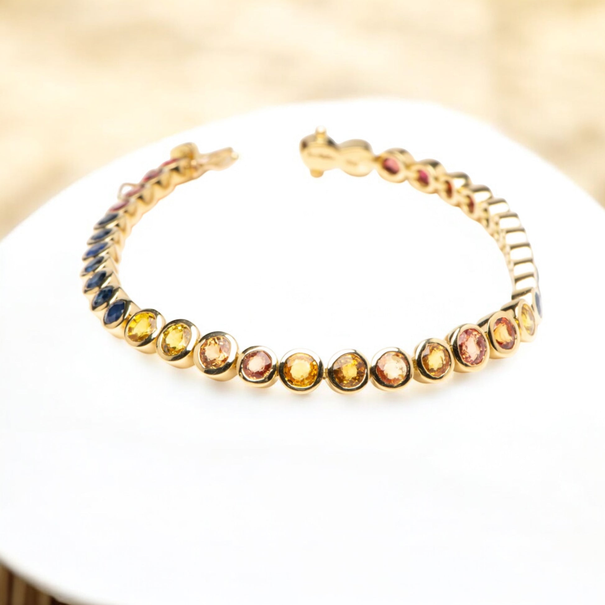 A rainbow spectrum of precious sapphire set in 18k yellow gold. Attach two together for a choker and pair with 17" necklace for a layered effect.