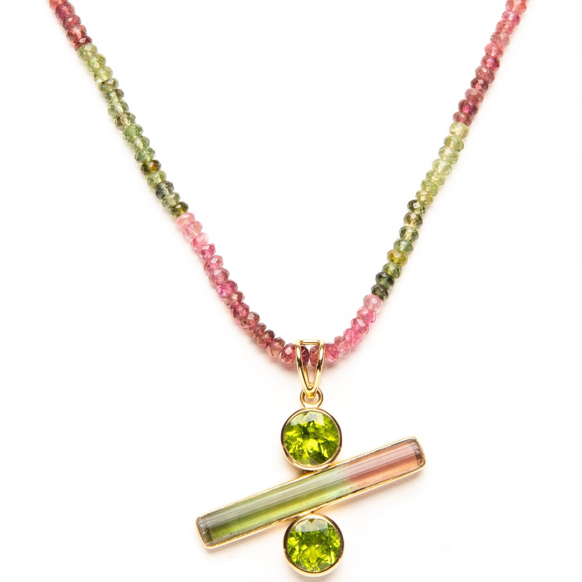 The melody of life never dies. Again and again, but always new. A state of repeated awareness, Tourmaline, a gemstone of abundance, carries all the colors of the spectrum and balances perfectly with these vibrant peridot, the Hawaiian Emerald. Supported with a beaded tourmaline necklace. 22k