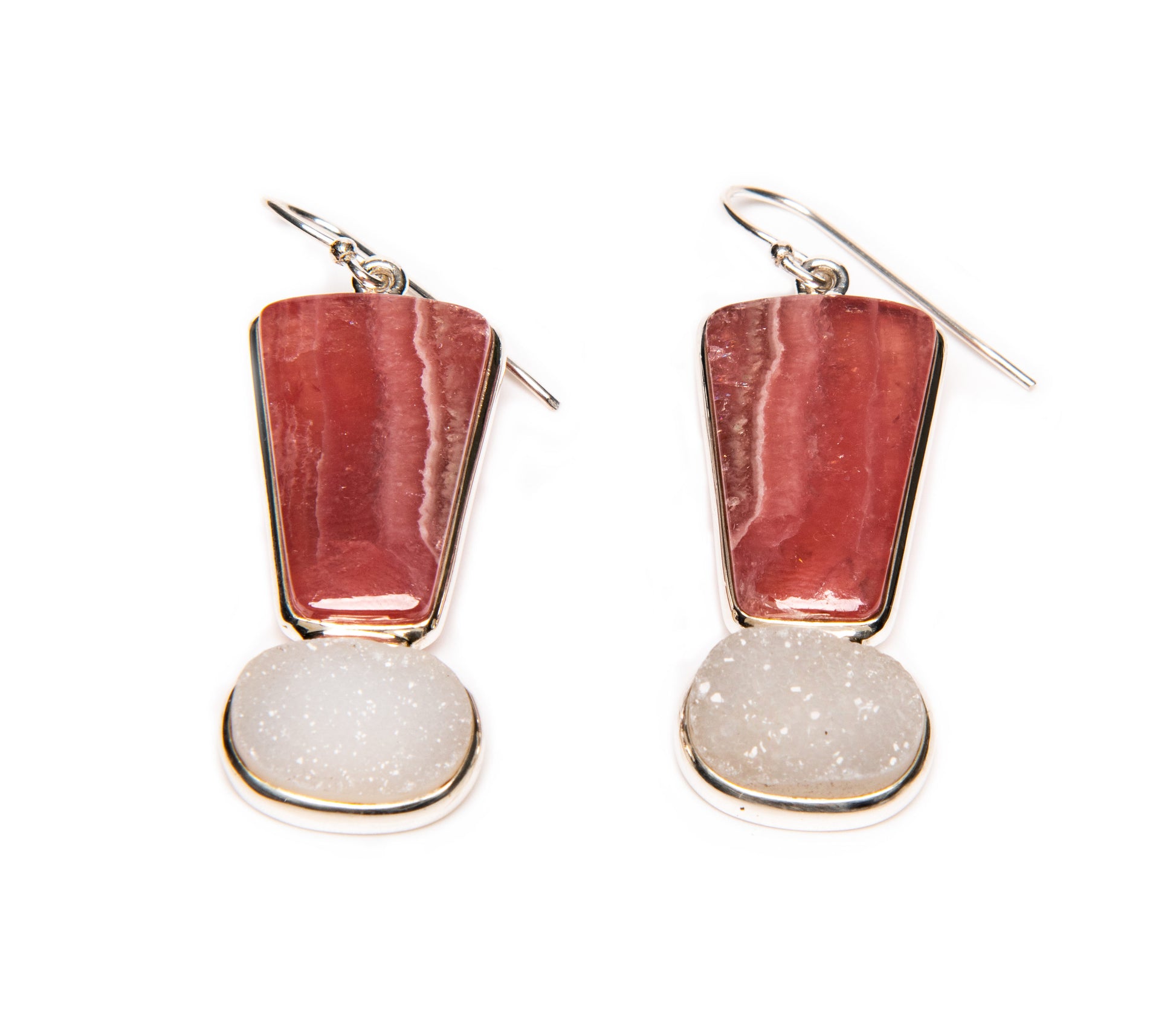 Stunning pink rhodochrosite accented with remarkable natural white diamond reminiscent druzy. Perfectly light statement gemstone earrings. 3”x2”