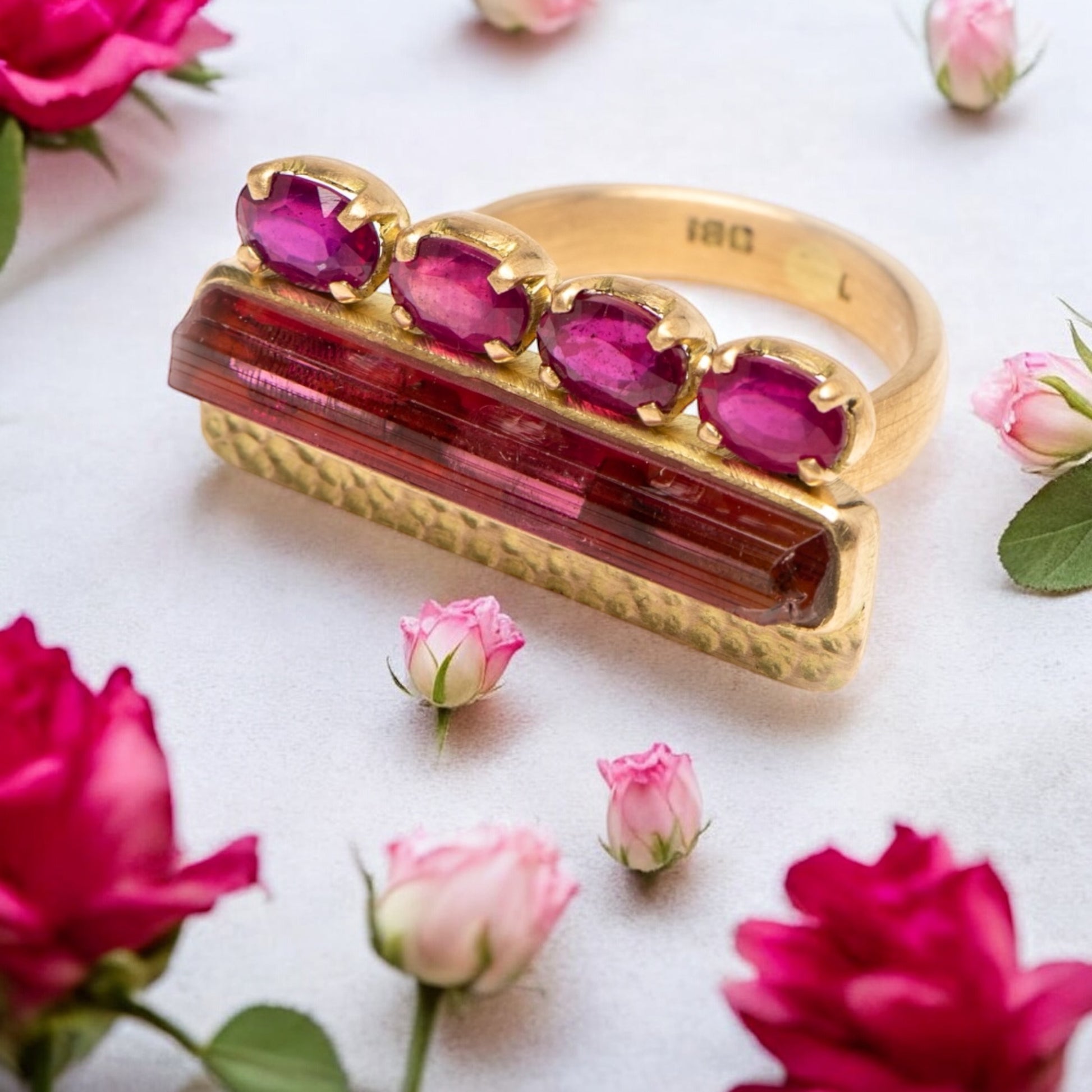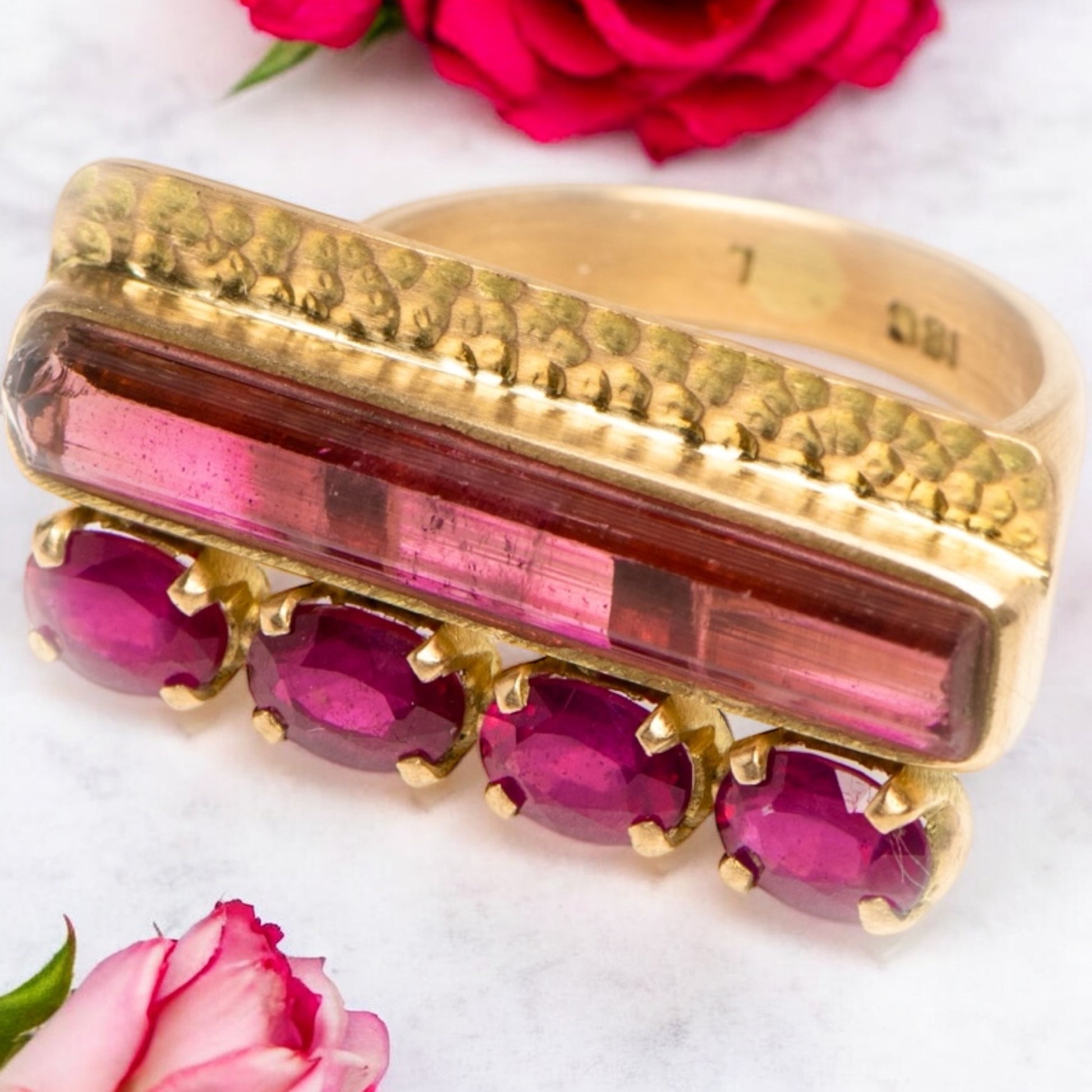 Pink Tourmaline Rod and 4 pink rubies perfect together in this artistic ring in 22k peach toned gold. Size 6.5