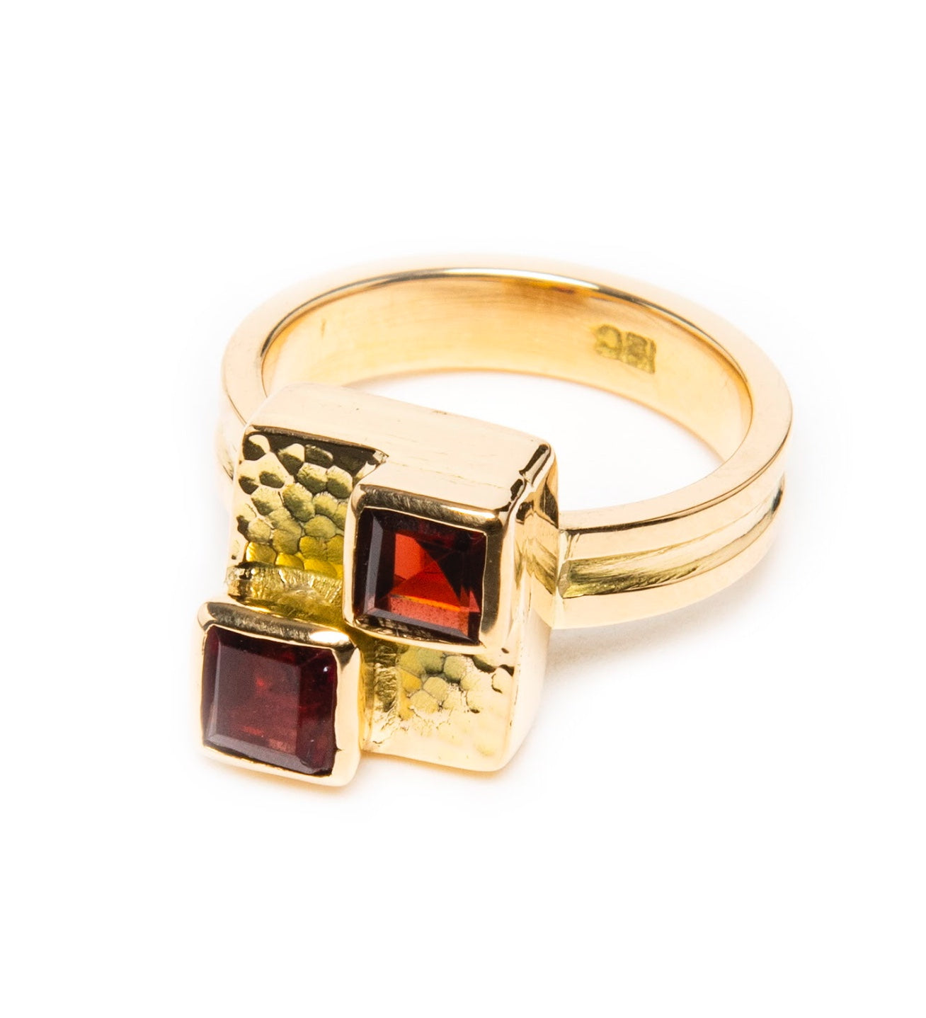 Cushion cut natural ruby in a unique diagonal, across shimmer textured frames in 18k yellow gold.