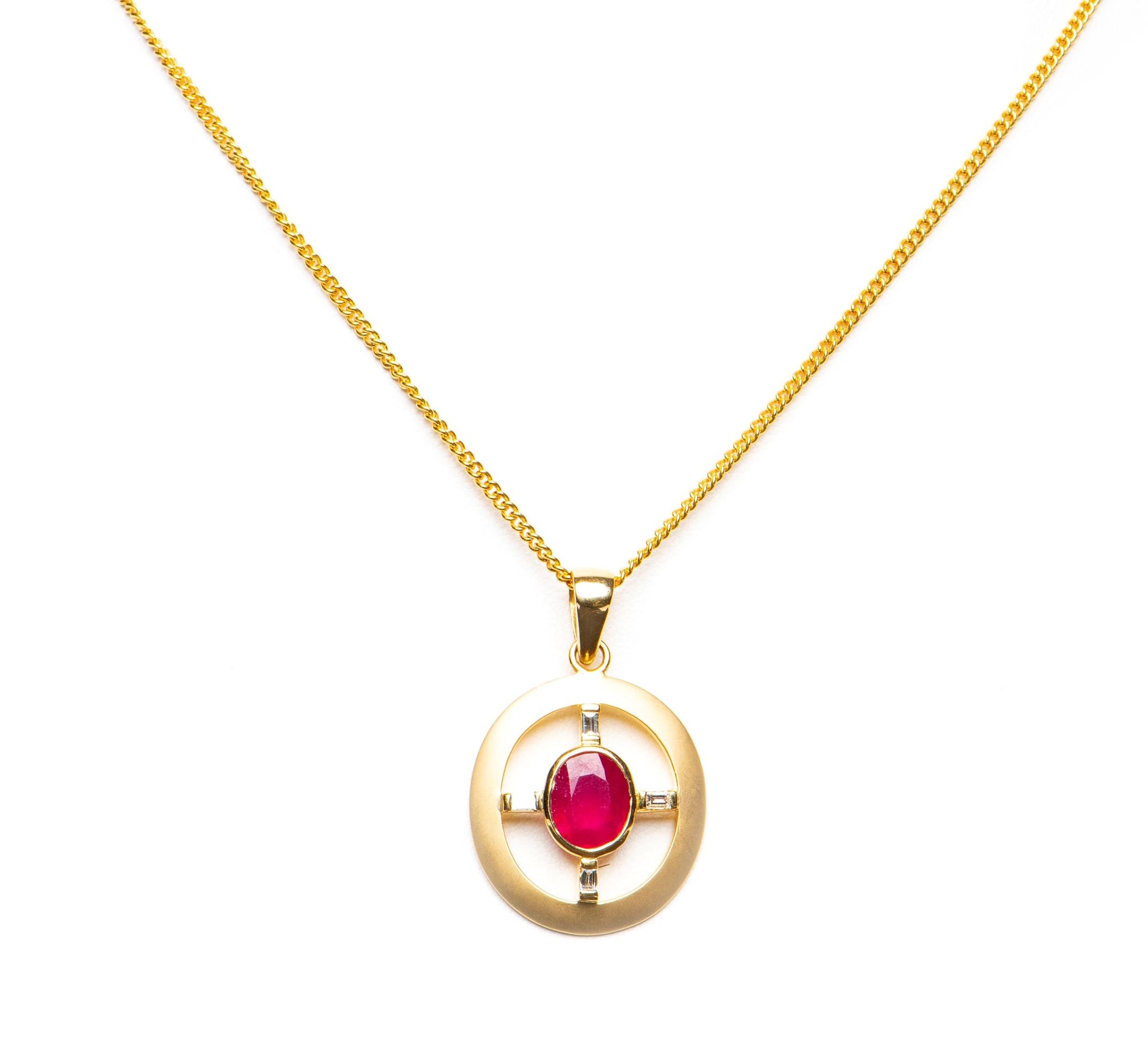 Stunningly brilliant, 18k yellow matte gold, diamonds and ruby in a rounded deco open frame. Worn with or without the 17" ruby necklace included.