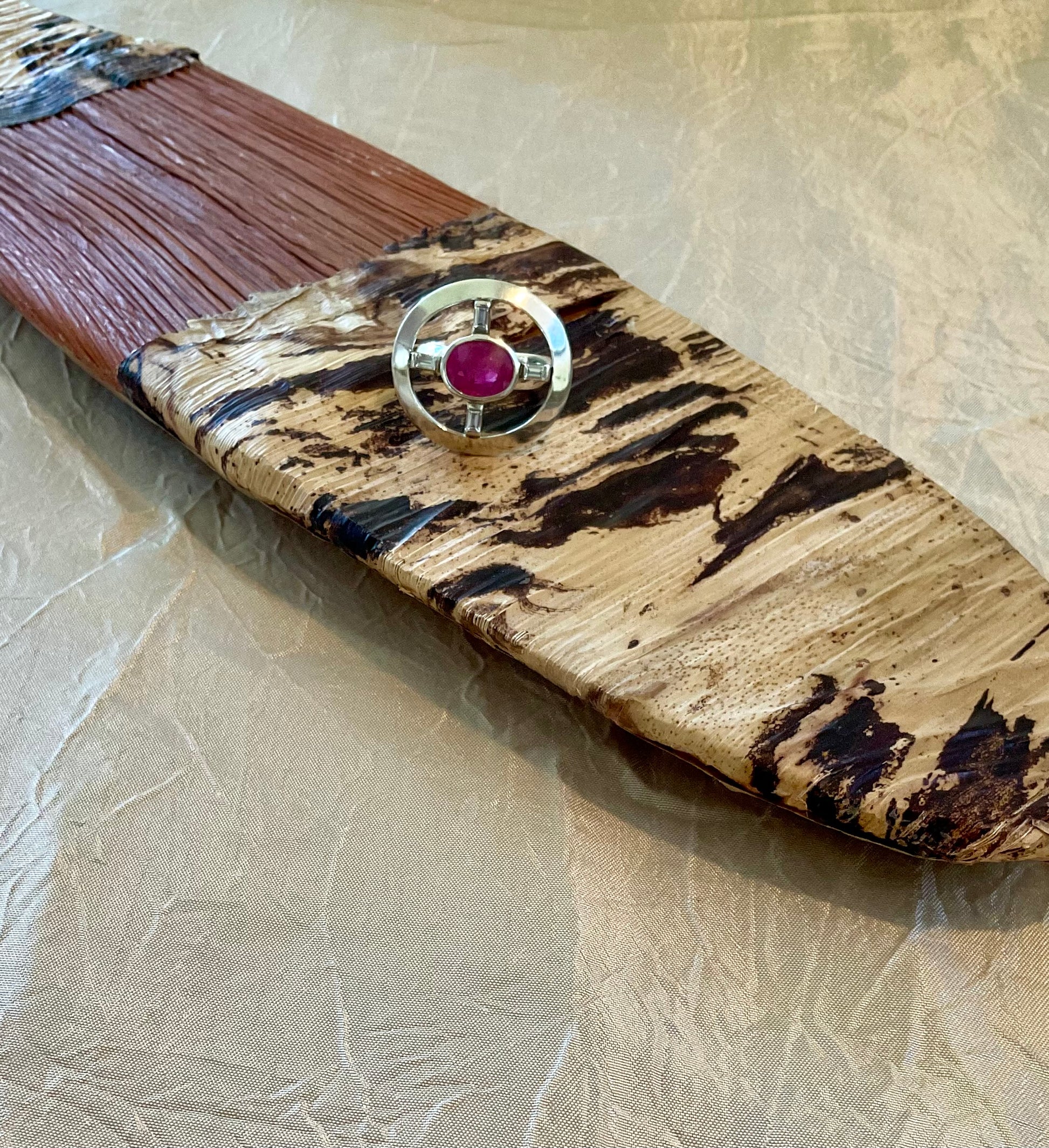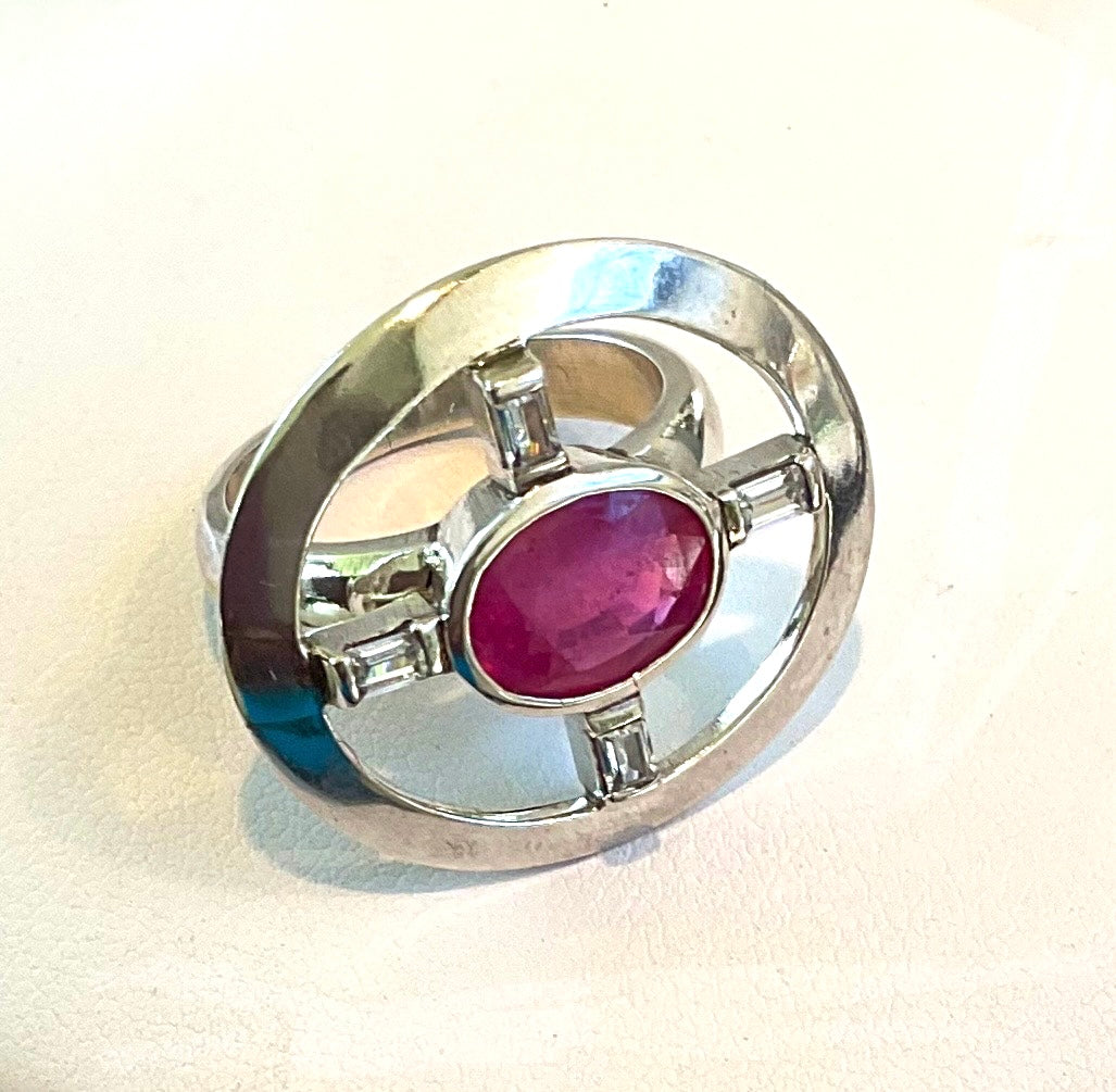Stunningly brilliant white sapphire baguettes and ruby in a rounded deco open frame between the fingers ring