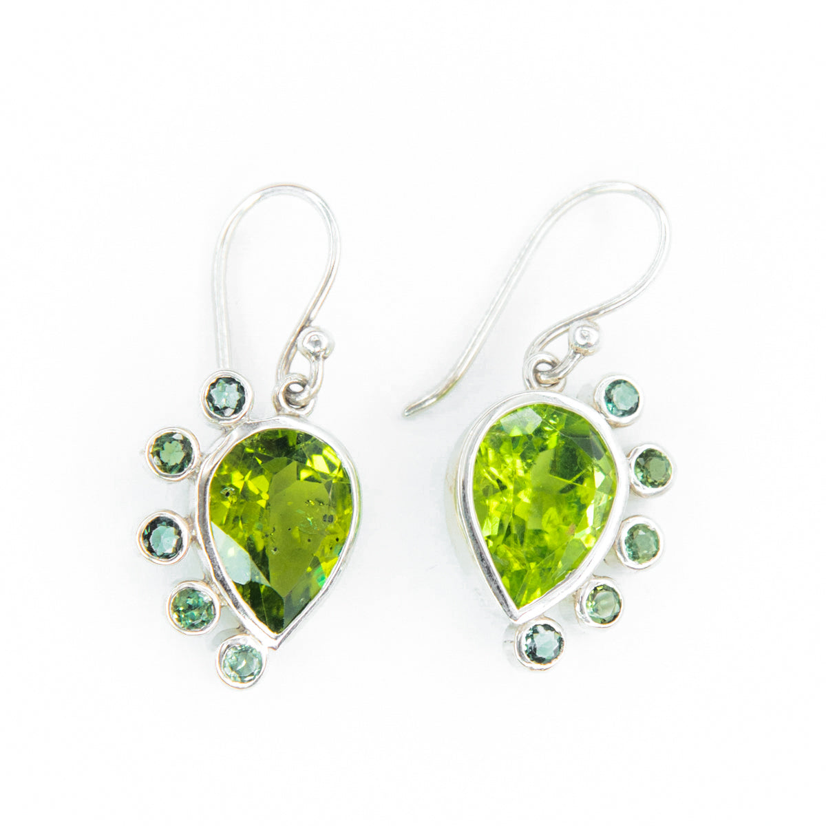 Peridot, vibrant green, gem of the cosmos! It can be found in meteorites and in its young form on green sands beach on the island of Hawaii. These brilliant peridot drops are accented with green tourmaline for a remarkably unique design.