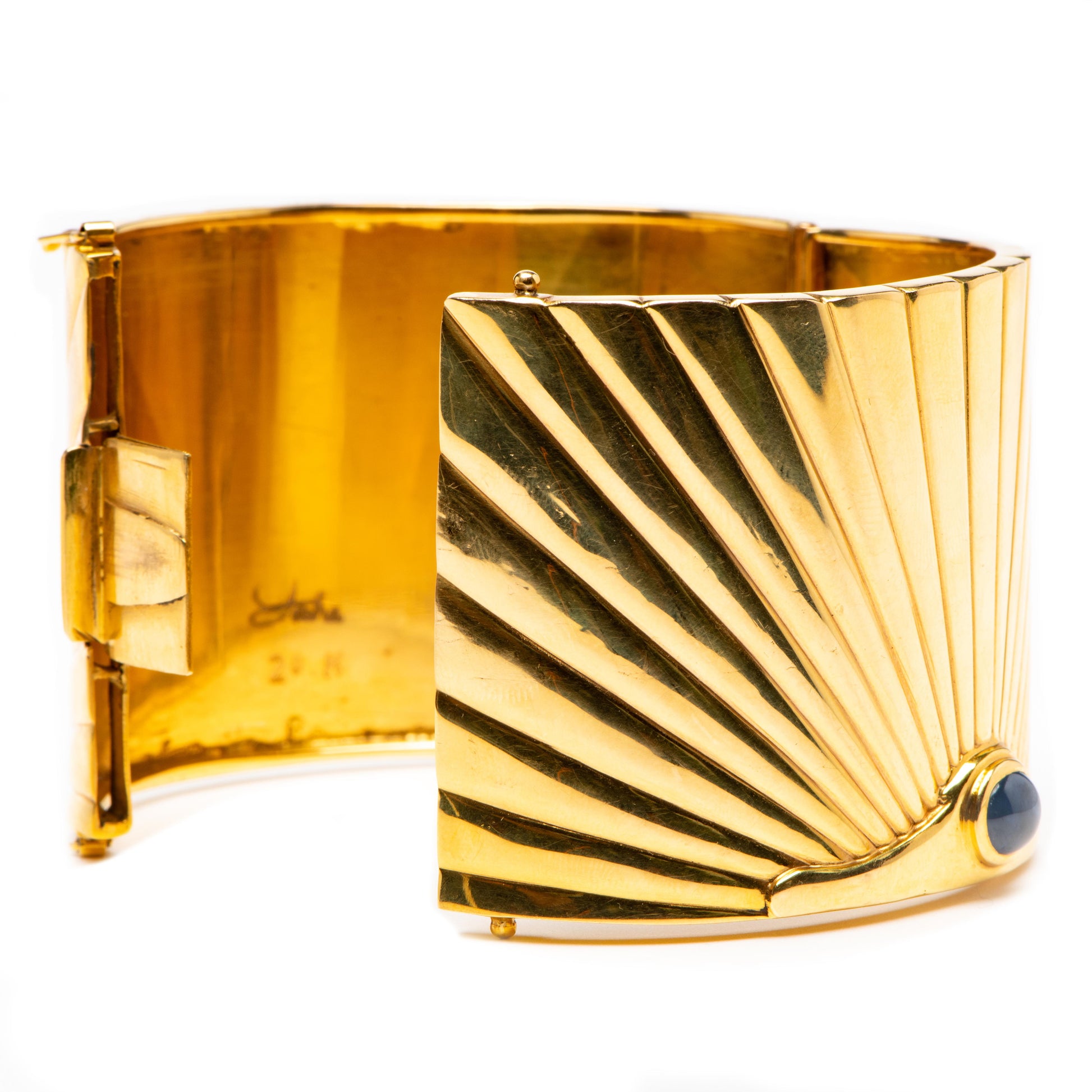 Hand crafted 20k gold cuff, a design of sun rays with a sapphire accent at the peak. Fits wrists between 7” and 7.75”.