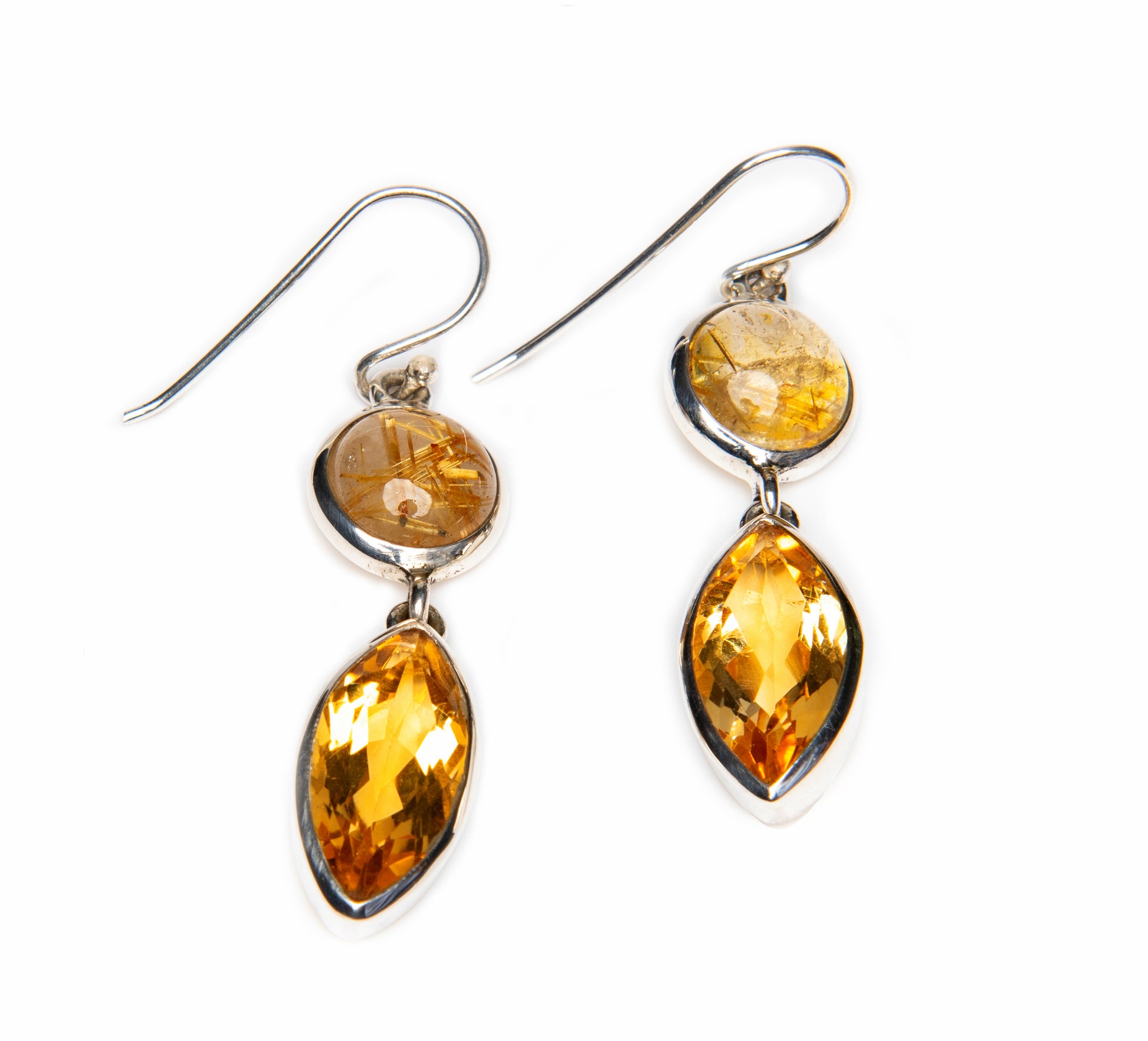 Cabuchon smooth rutilated quartz and golden citrene. Formal or casual dangles.