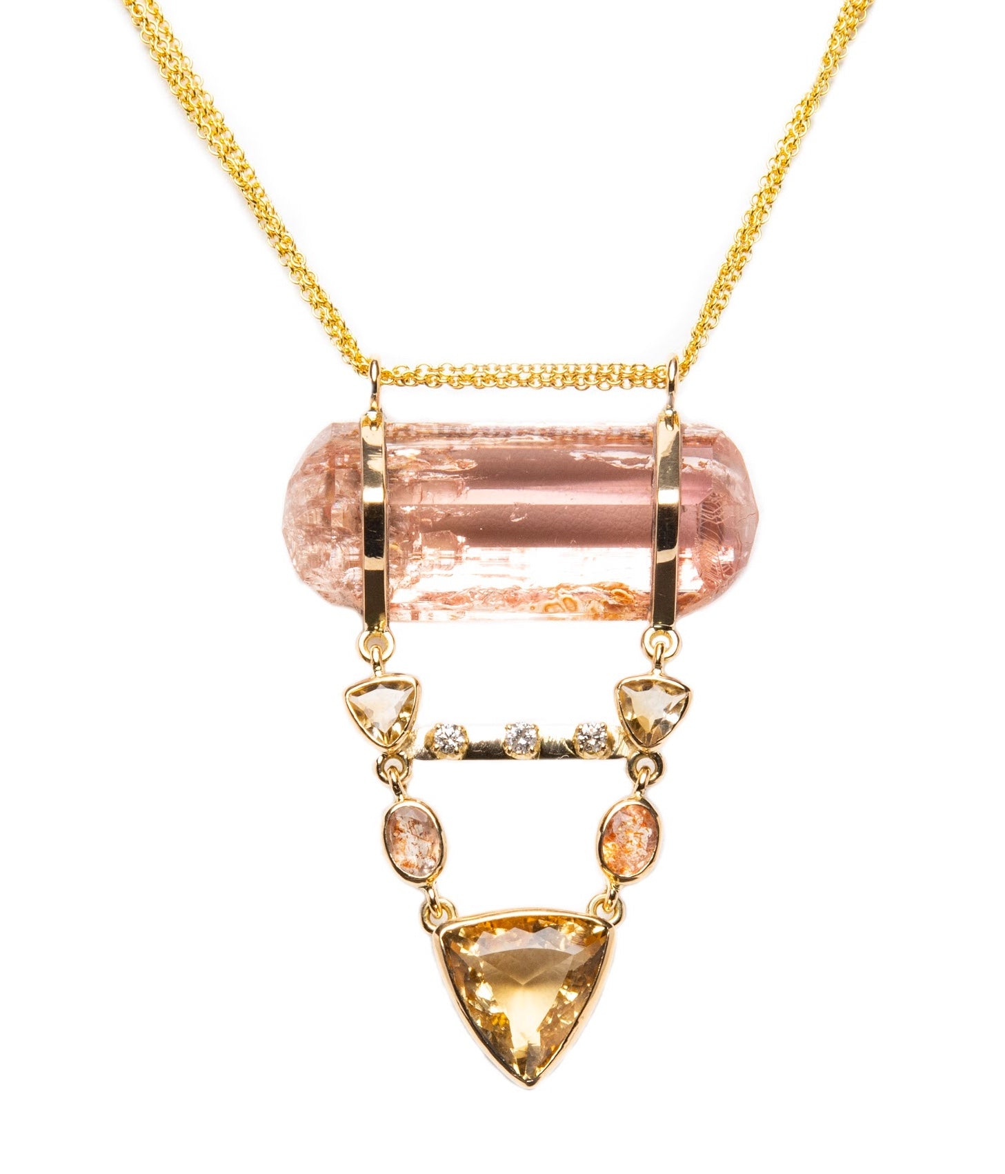 Dancing in the light of the perfect sunset! A breathtaking statement of gems. This remarkable 20ct Natural uncut golden peach toned imperial Topazis connected to golden citrine, sunstone, and 0.3 ctw diamond. Imperial Topaz is particularly beneficial for recharging the physical body, blood circulation, overcoming depression and nervous exhaustion. With a 3 strand 18” chain. Absolutely one of a kind.
