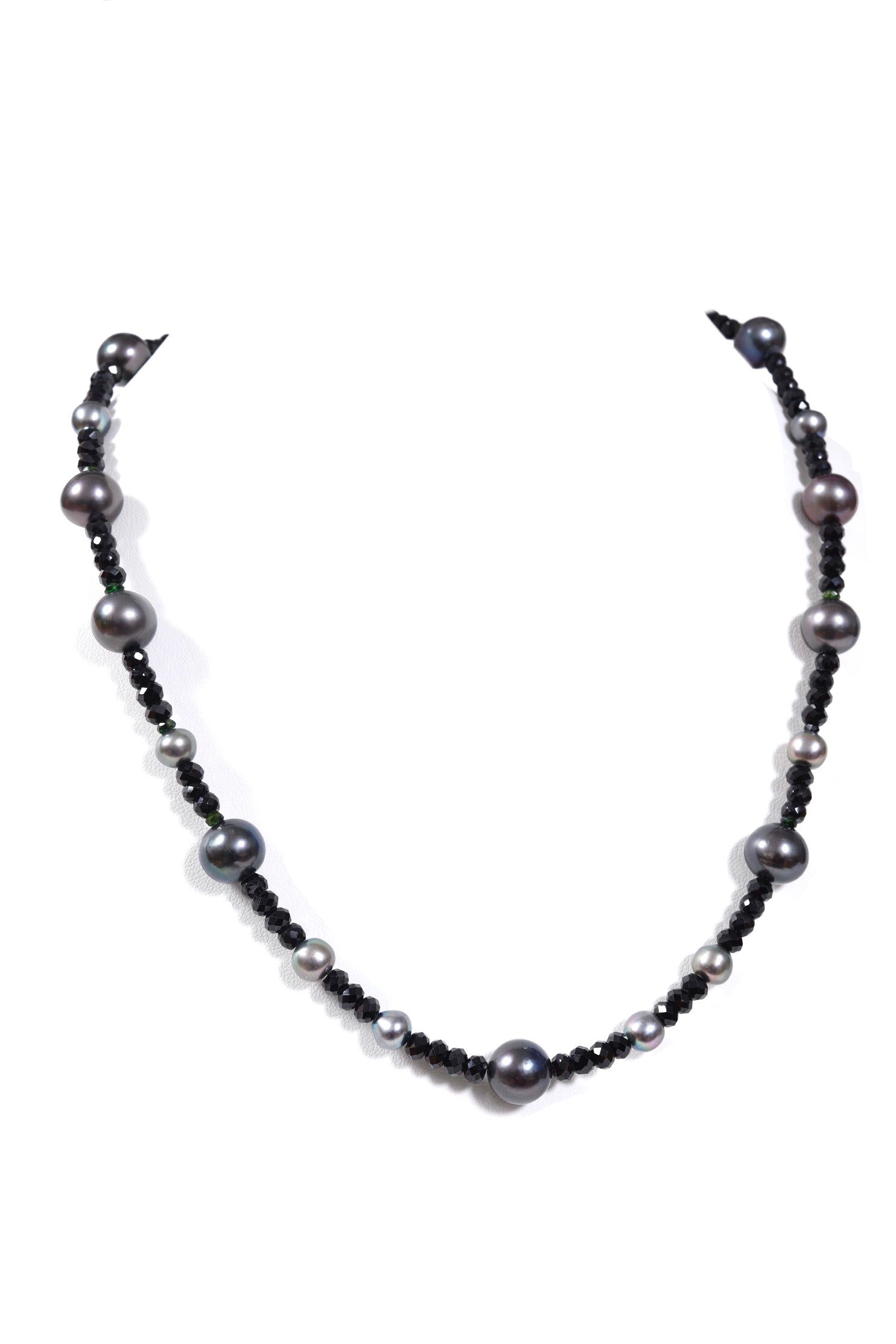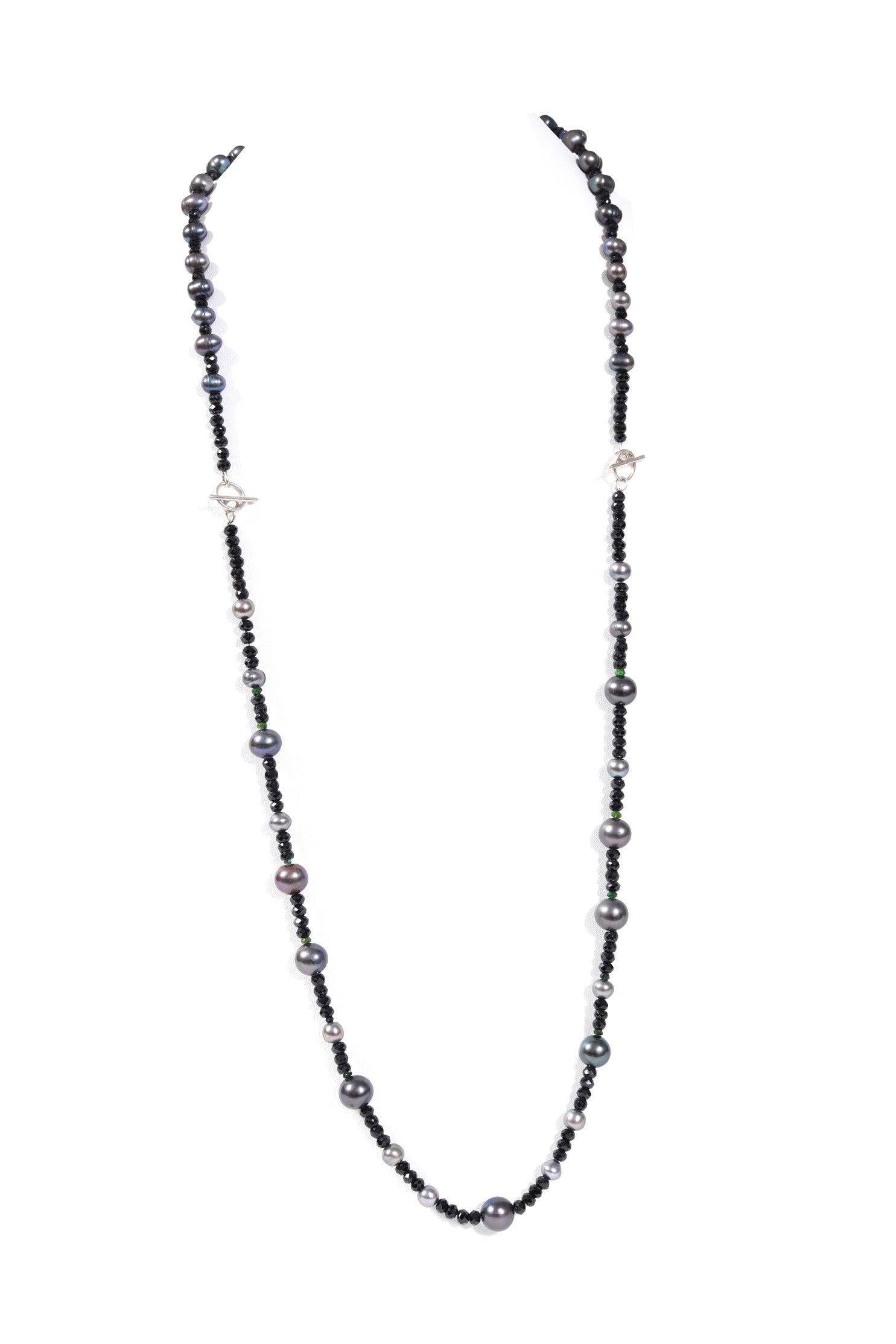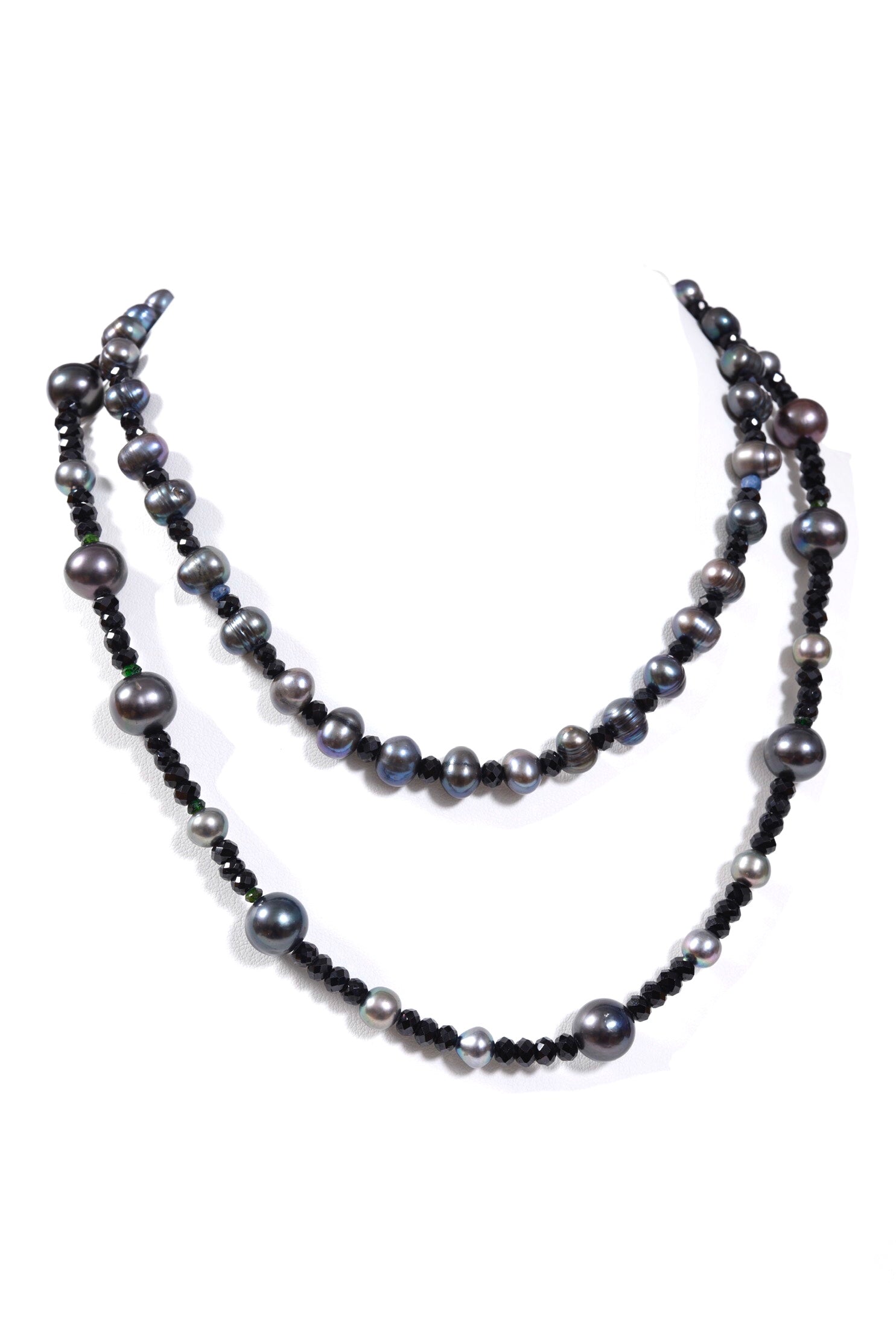 The perfect pearl statement. Two pieces that can be worn separately, easily doubled, or long as one. Tahitian pearls, and black fresh water pearls are combined with sapphire,spinel and tourmaline for a highly resourceful necklace that wears with anything. Wear casual, formal or fashionable, short, or long.