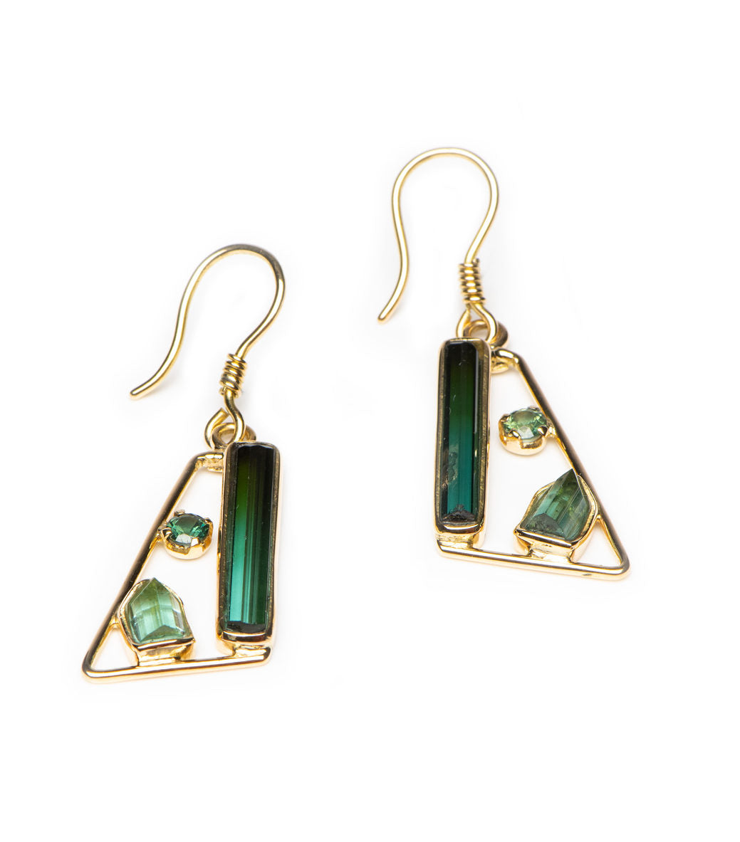 Teal and chrome tourmaline rod, crystal and sapphire are brilliantly collected in this triangular frame. length=1.3”