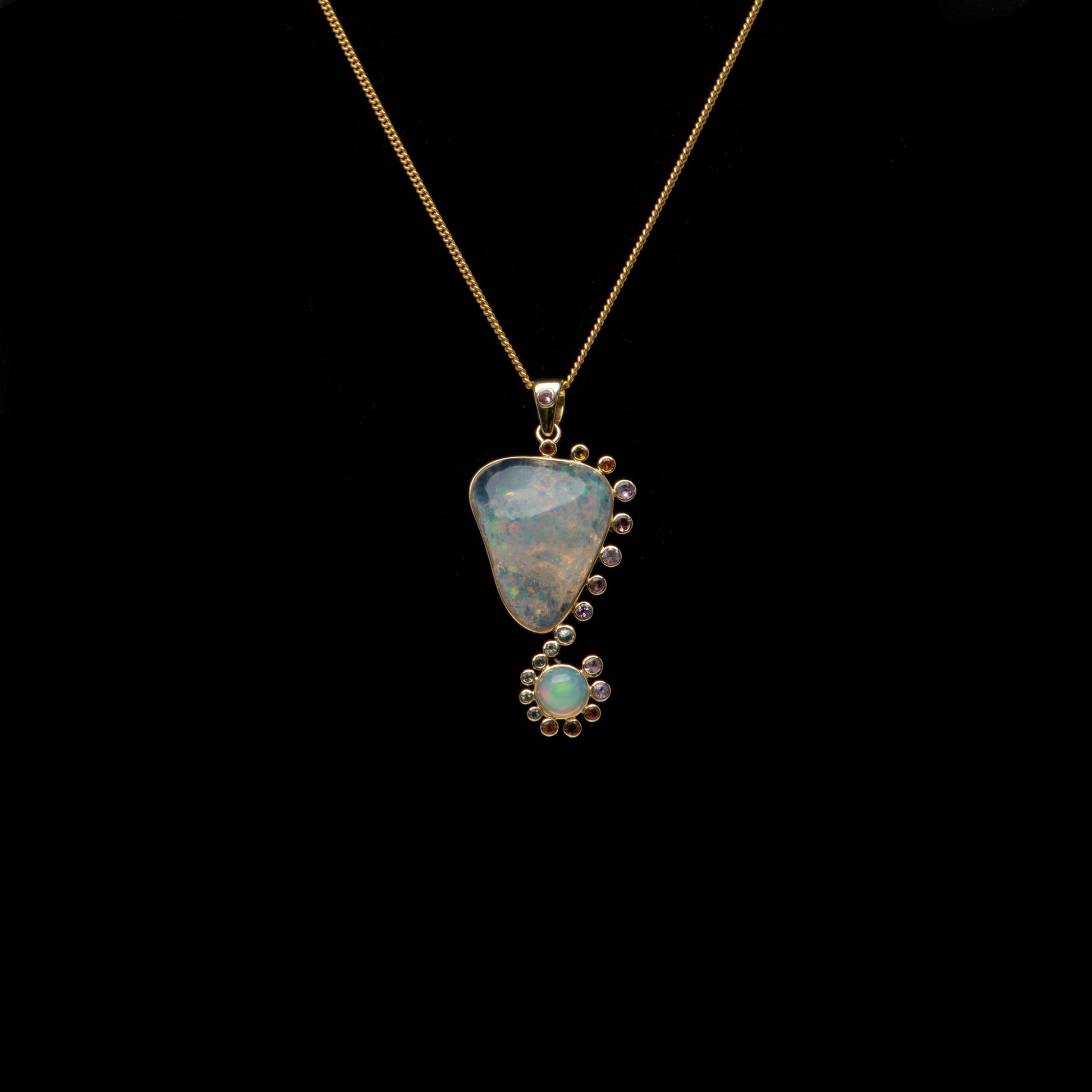 Art Jewelry at its very best! A one of a kind rough uncut opal with pink and green flashes is accented with pink and green sapphire and a perfect refined muti-fire opal at the end of infinity! Absolutely one of a kind.